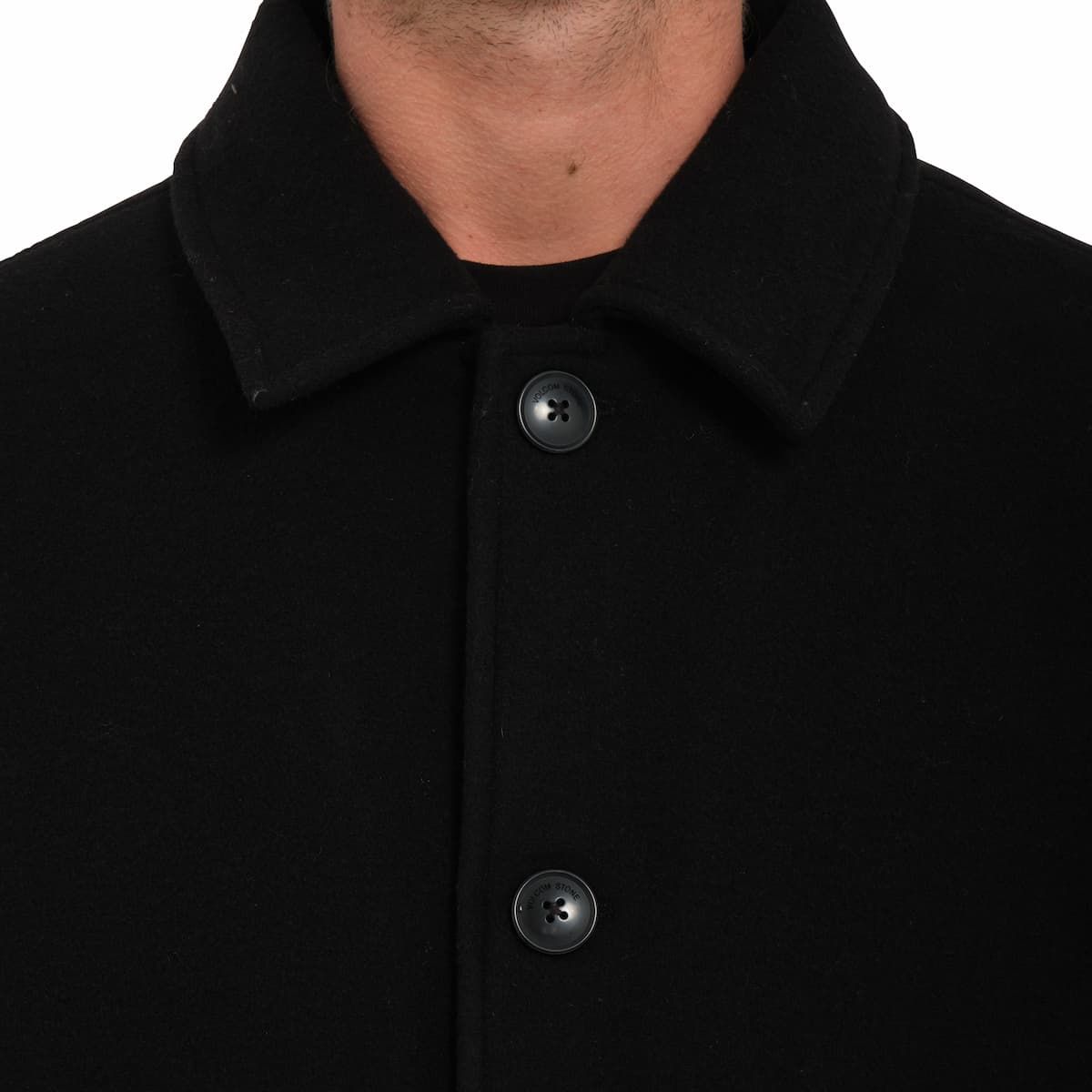 El abrigo Floyder Peacoat Negro para hombre tiene una etiqueta de garantía Volcom en el interior.