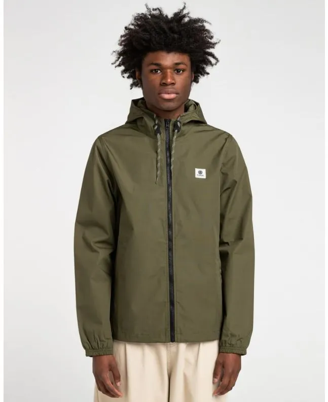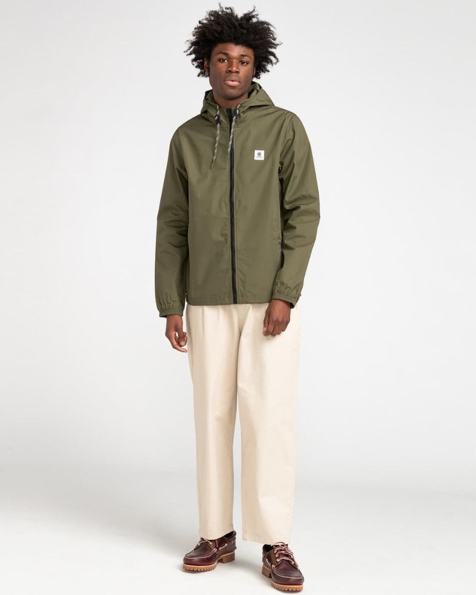 La chaqueta ligera y resistente al agua Wolfeboro Alder Light verde para hombre tiene una etiqueta con el logo de Element cosido en el lateral izquierdo del pecho