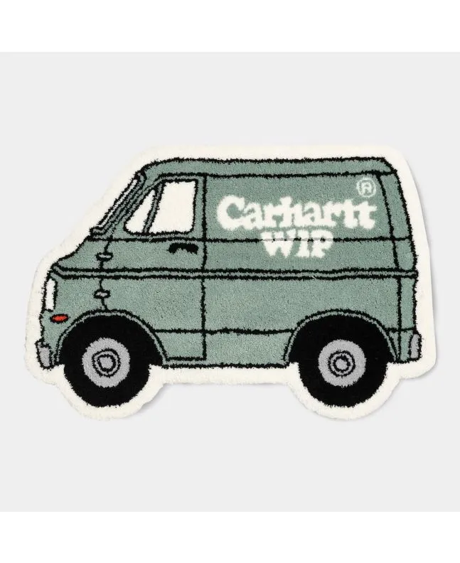 Esta divertida alfombra con forma de furgoneta cuenta con mechones elaborados a mano, base antideslizante de silicona y detalles Carhartt tejidos.