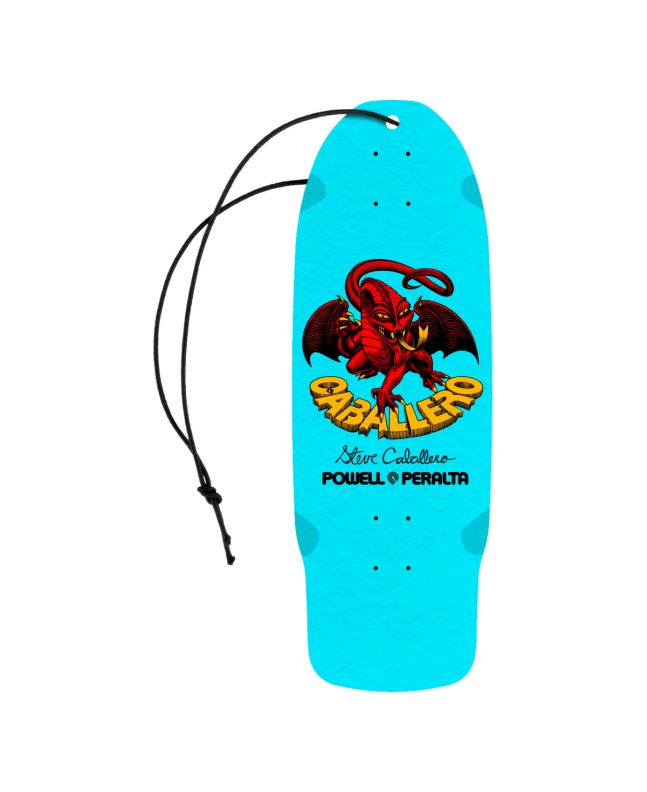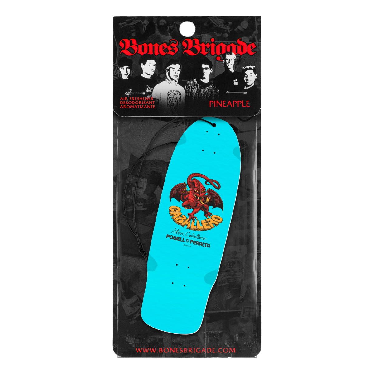 Este ambientador de coche cuenta con un duradero olor a piña, junto con la forma y la impresión gráfica de la Tabla de Skate Steve Caballero Light Blue de la Exclusiva Colección Bones Brigade Series 15 de Powell Peralta.