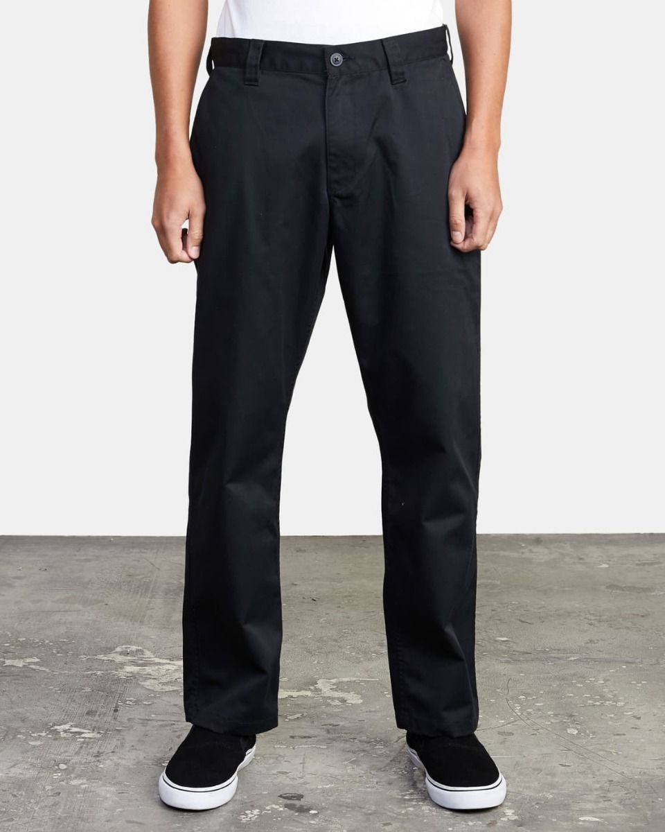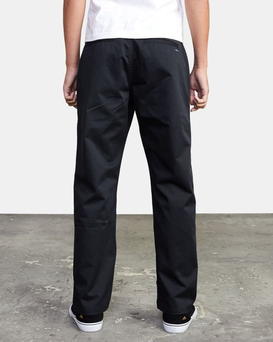 Los pantalones Americana Chino negros para hombre tienen una etiqueta de Rvca cosida en el bolsillo posterior.