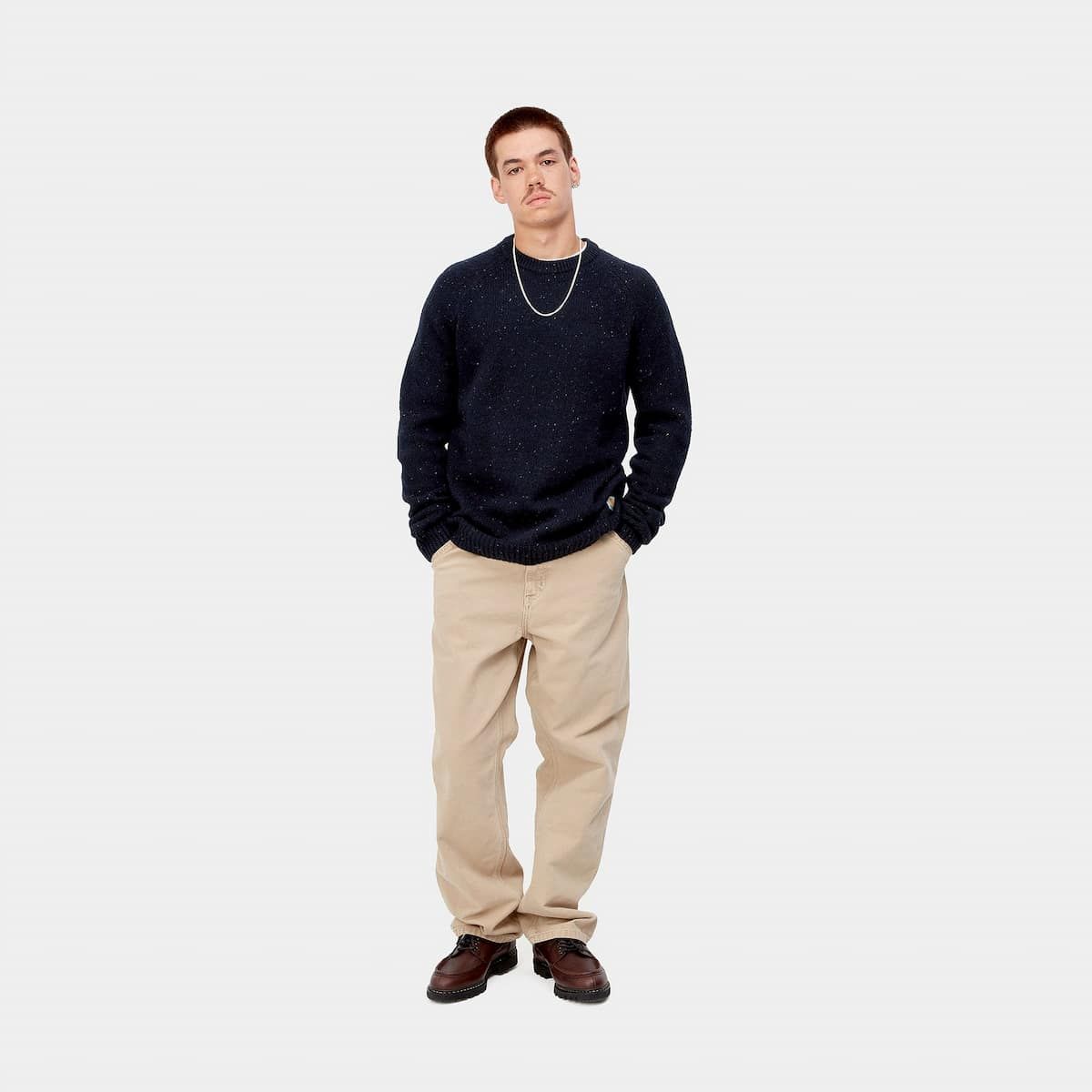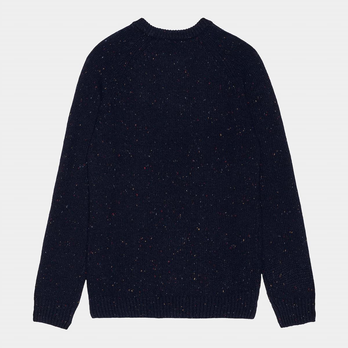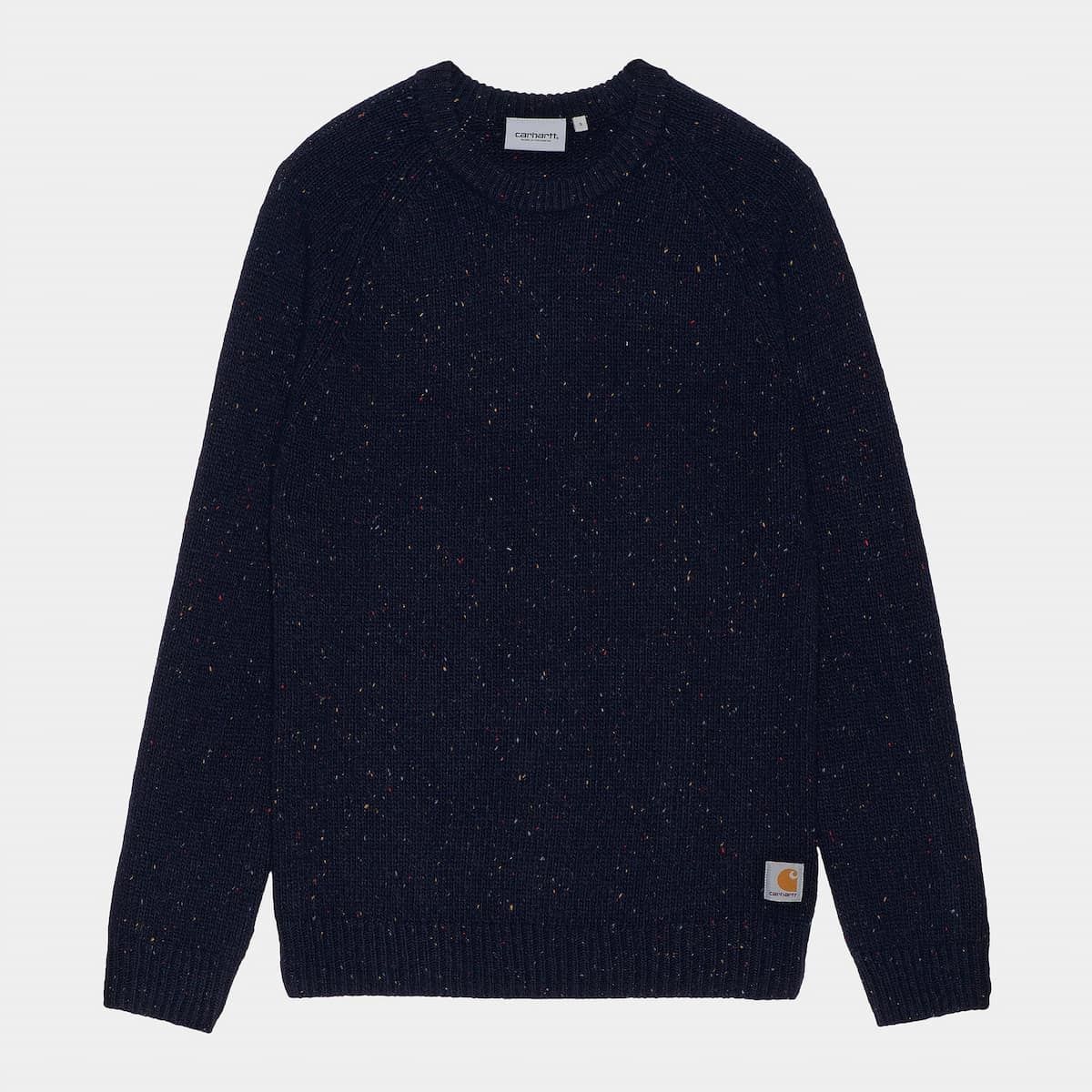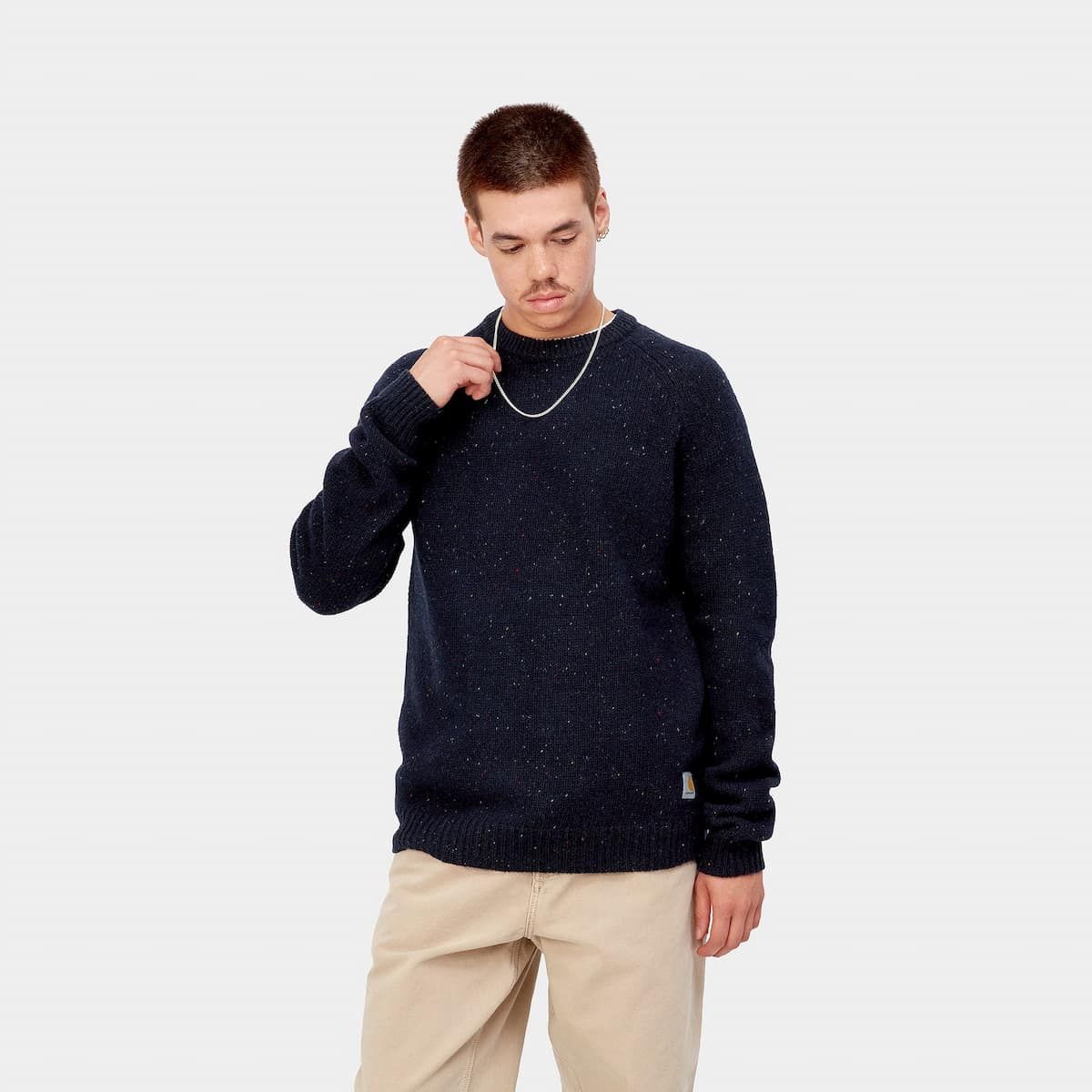 El jersey para hombre Anglistic Sweater en azul marino (Speckled Dark Navy Heather) de Carhartt WIP está confeccionado con 80% lana y 20% algodón de espesor 3.