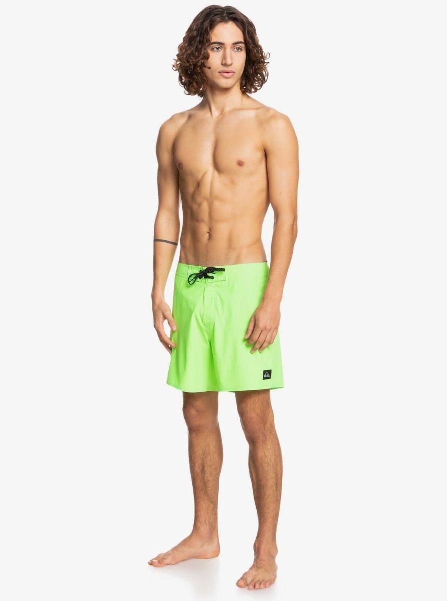 Este bañador más corto, de 38 cm de longitud, cuenta con cintura elástica con cierre de cordón ajustable, slip interior de malla, bolsillos traseros con cierre de cremallera y cordón elástico para llaves en el interior del bolsillo, y una etiqueta con el logo de la ola y la montaña de Quiksilver cosida en la pierna izquierda.