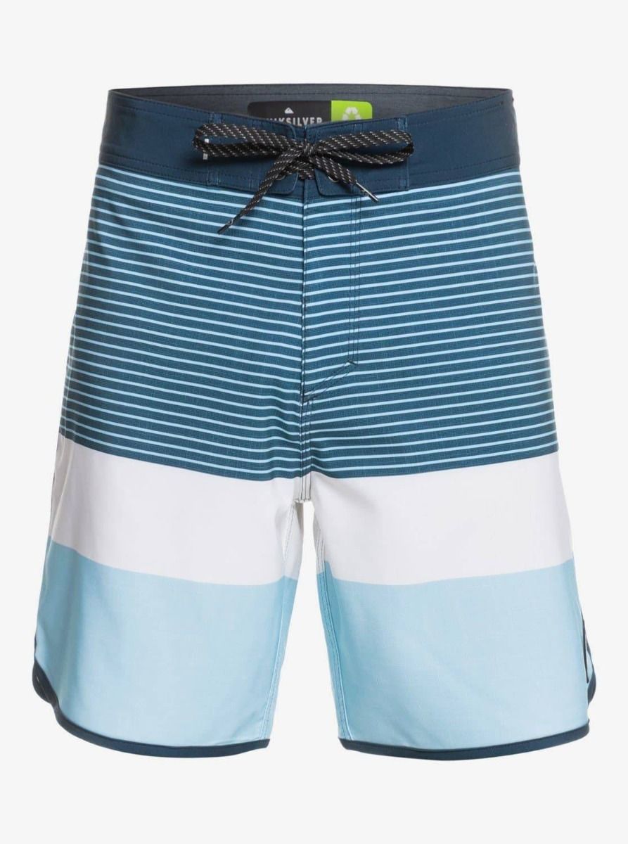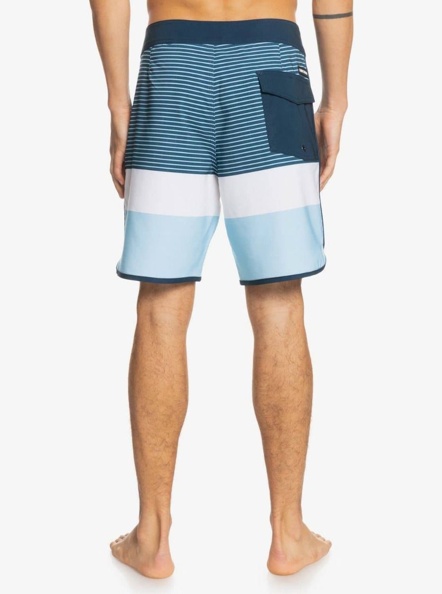Este bañador corto de 45,7 cm de longitud cuenta con cintura elástica con cierre de cordón ajustable, bragueta performance, bolsillos traseros de solapa con cierre de velcro, agujero de drenaje y cordón elástico para llaves, y una etiqueta con el logo de la ola y la montaña de Quiksilver cosida en la pierna izquierda.