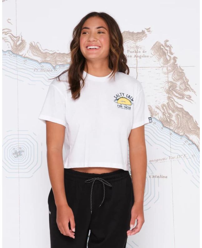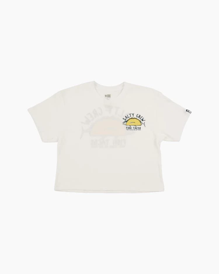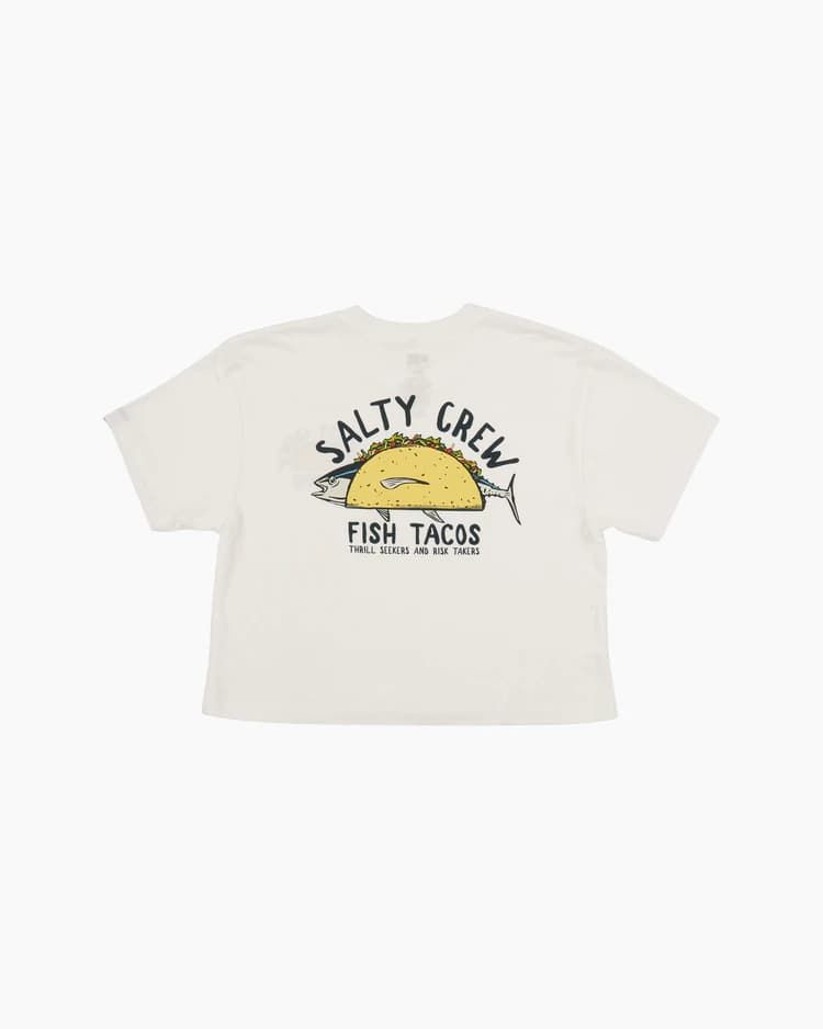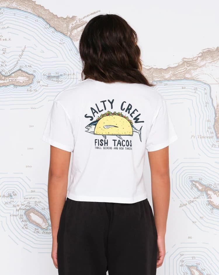 Esta camiseta de corte cropped cuenta con cuello redondo, manga corta y estampado original de Salty Crew "Fish Tacos" junto con la leyenda"Thrill Seakers and Risk Takers" (Los que buscan emociones y se arriesgan) serigrafiados en el lado izquierdo del pecho y la espalda.