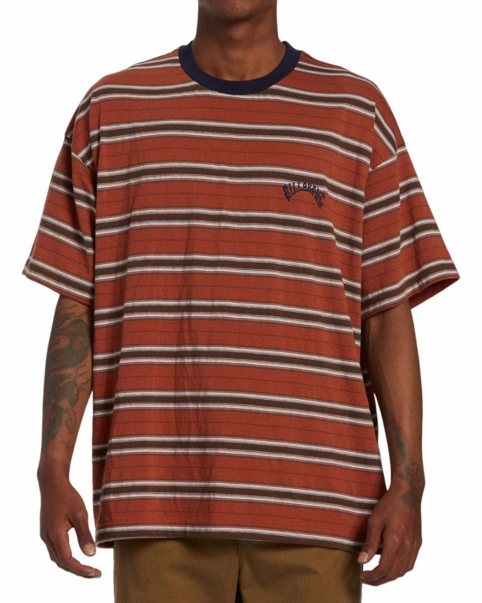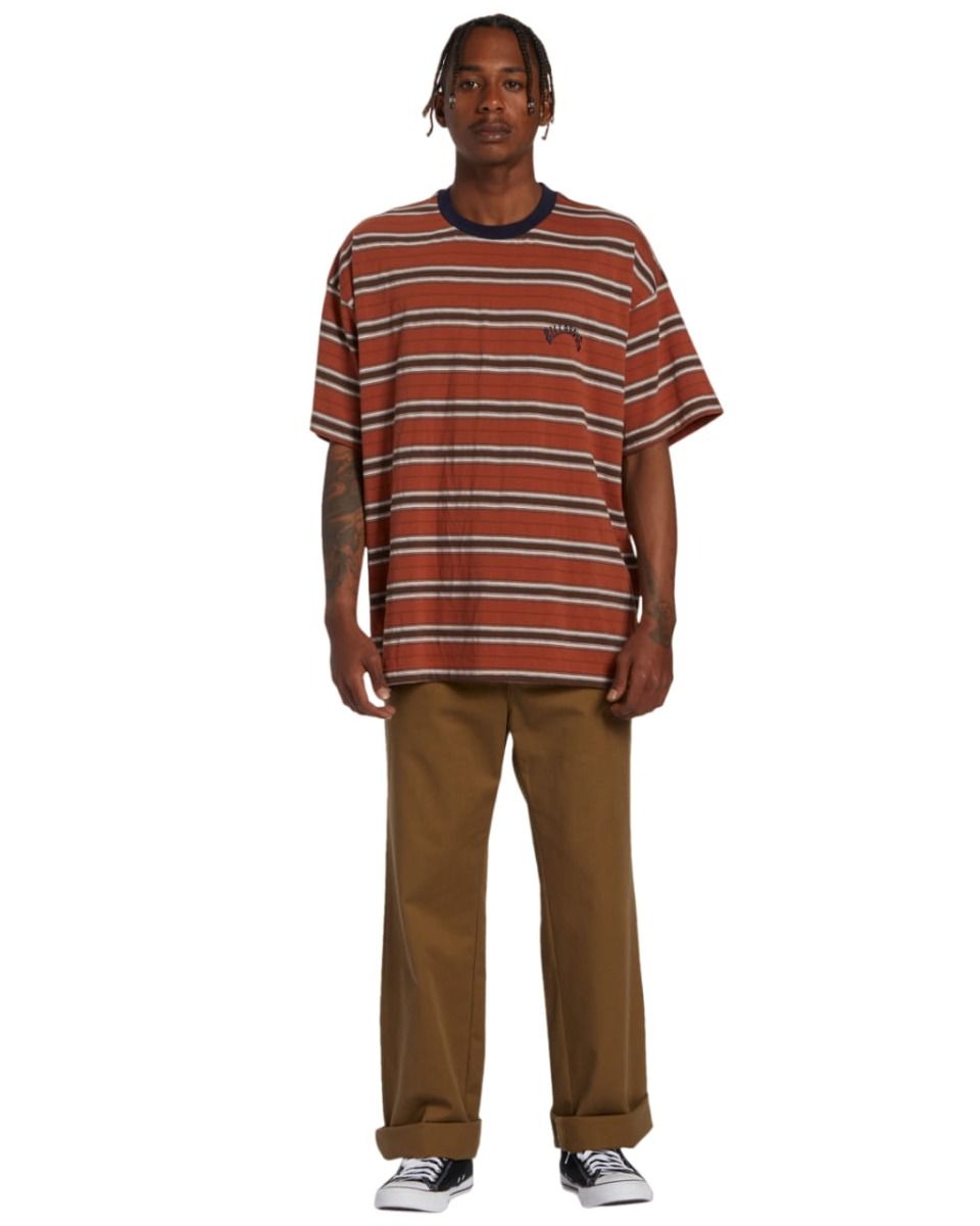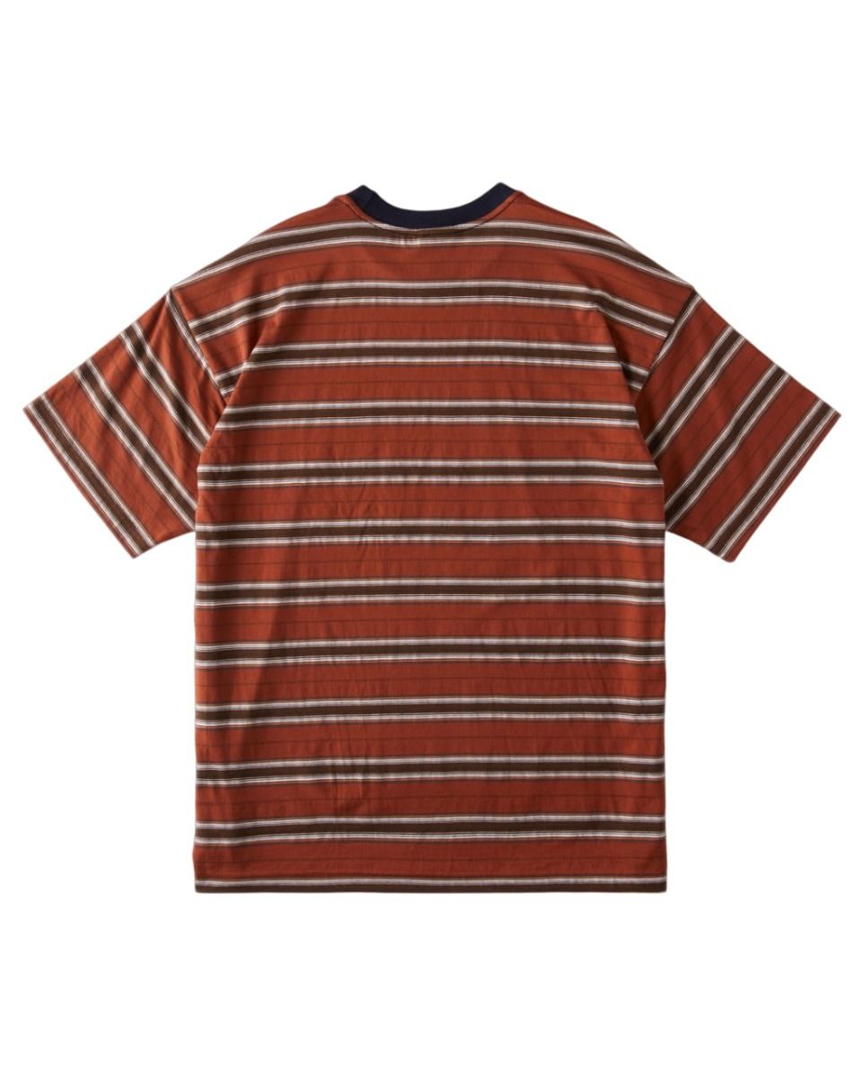 Esta camiseta para hombre, perteneciente a la Colección No Fixed Address de Billabong, presenta corte normal, cuello redondo, manga corta, rayas teñidas en hilo, lavado en prenda para mayor suavidad y bordado Billabong en el pecho.