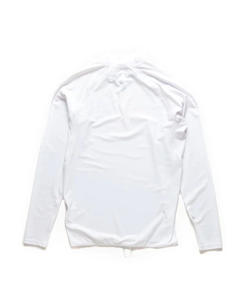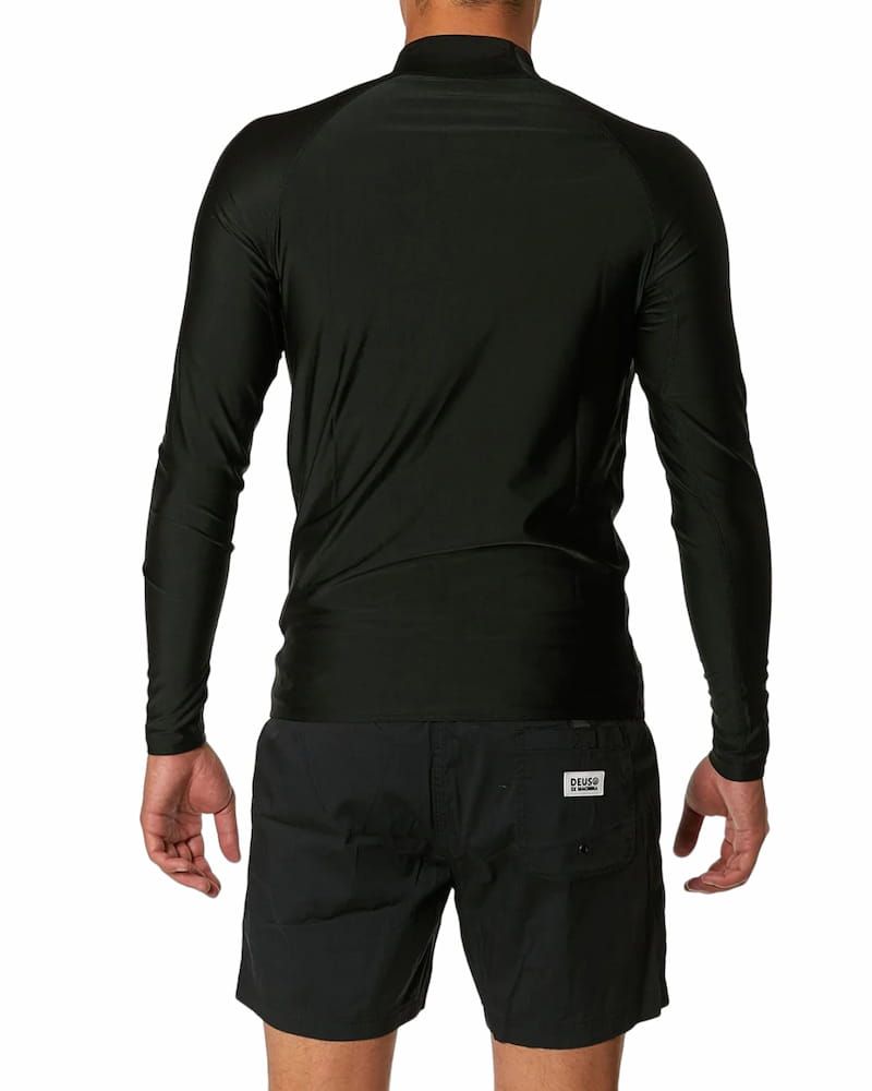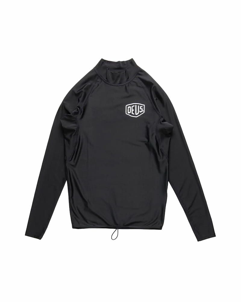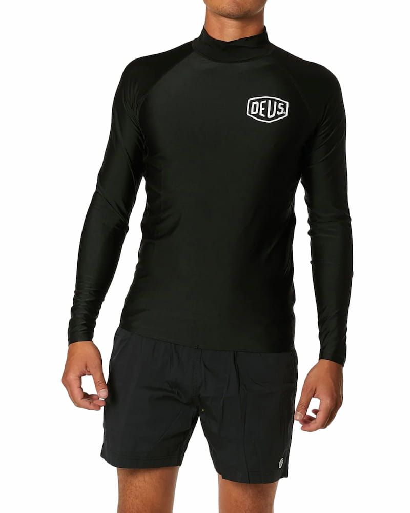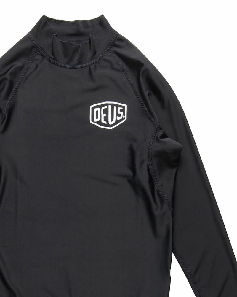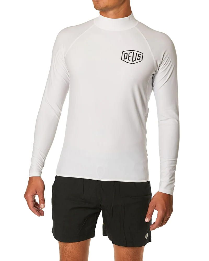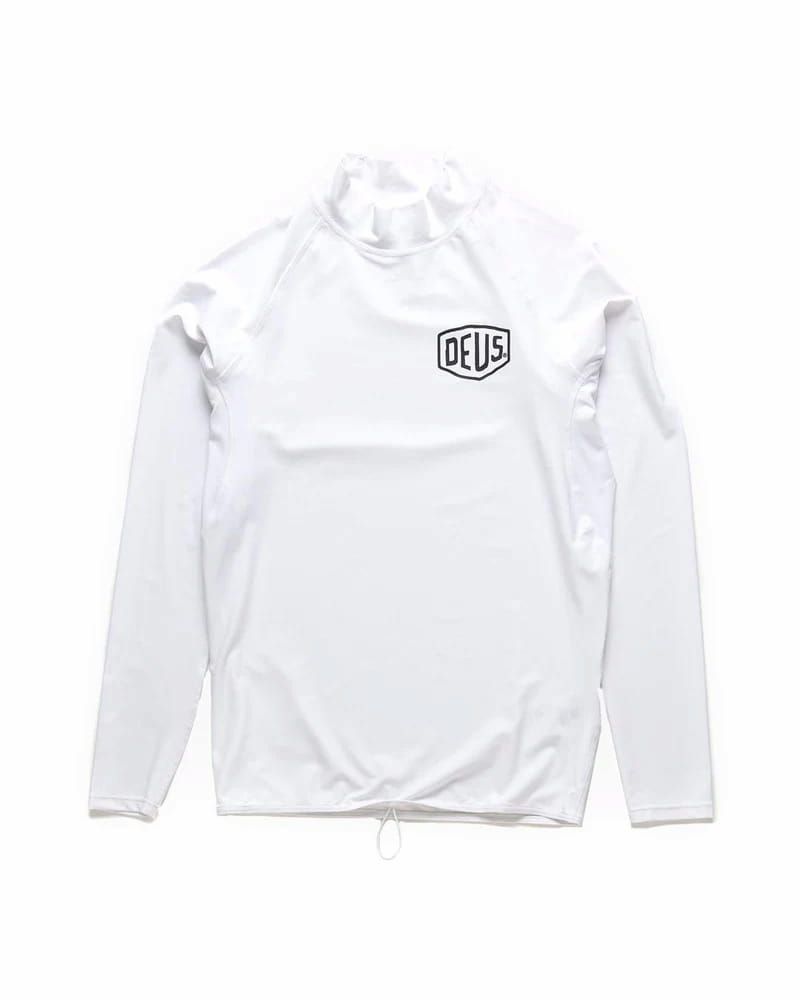 Esta licra antiabrasión, disponible en color blanco (White) y negro (Black), cuenta con manga larga, cuello alto, factor de protección solar UPF 50+, protección Ultravioleta y el logo Deus impreso en el lado izquierdo del pecho.