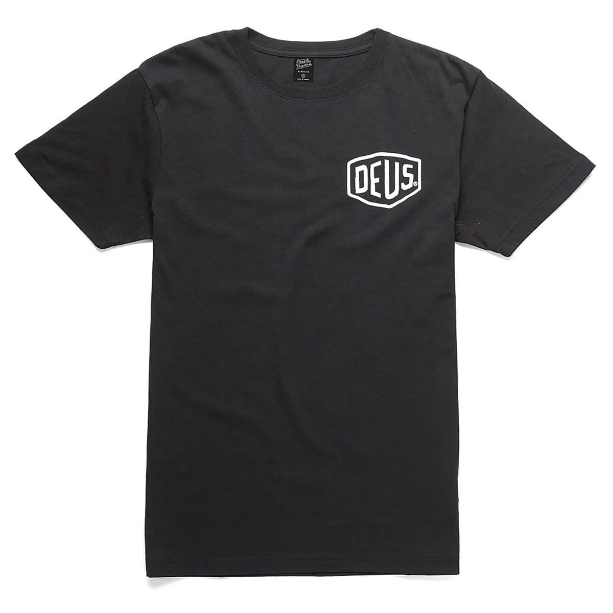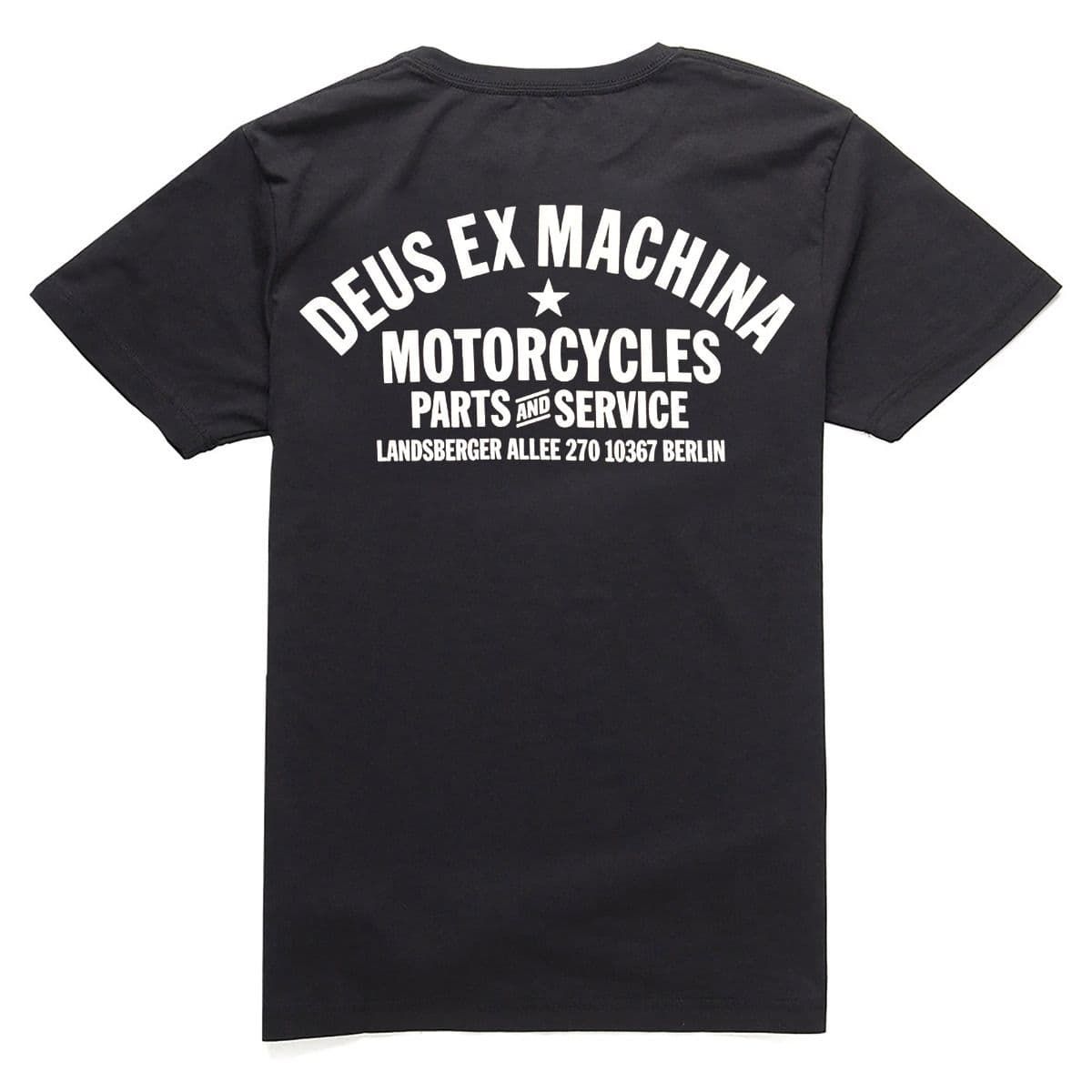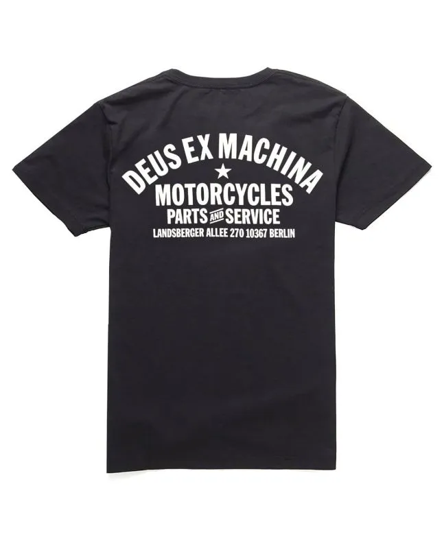 Esta camiseta negra de ajuste regular, perteneciente a la colección "Deus Ex Machina Classics", cuenta con cuello redondo, manga corta, el logo de Deus estampado en el lado izquierdo del pecho y la leyenda “Deus Ex Machina. Motorcycles. Parts and Service. Landsberger Allee 270 10367 Berlin" impresa en la espalda.