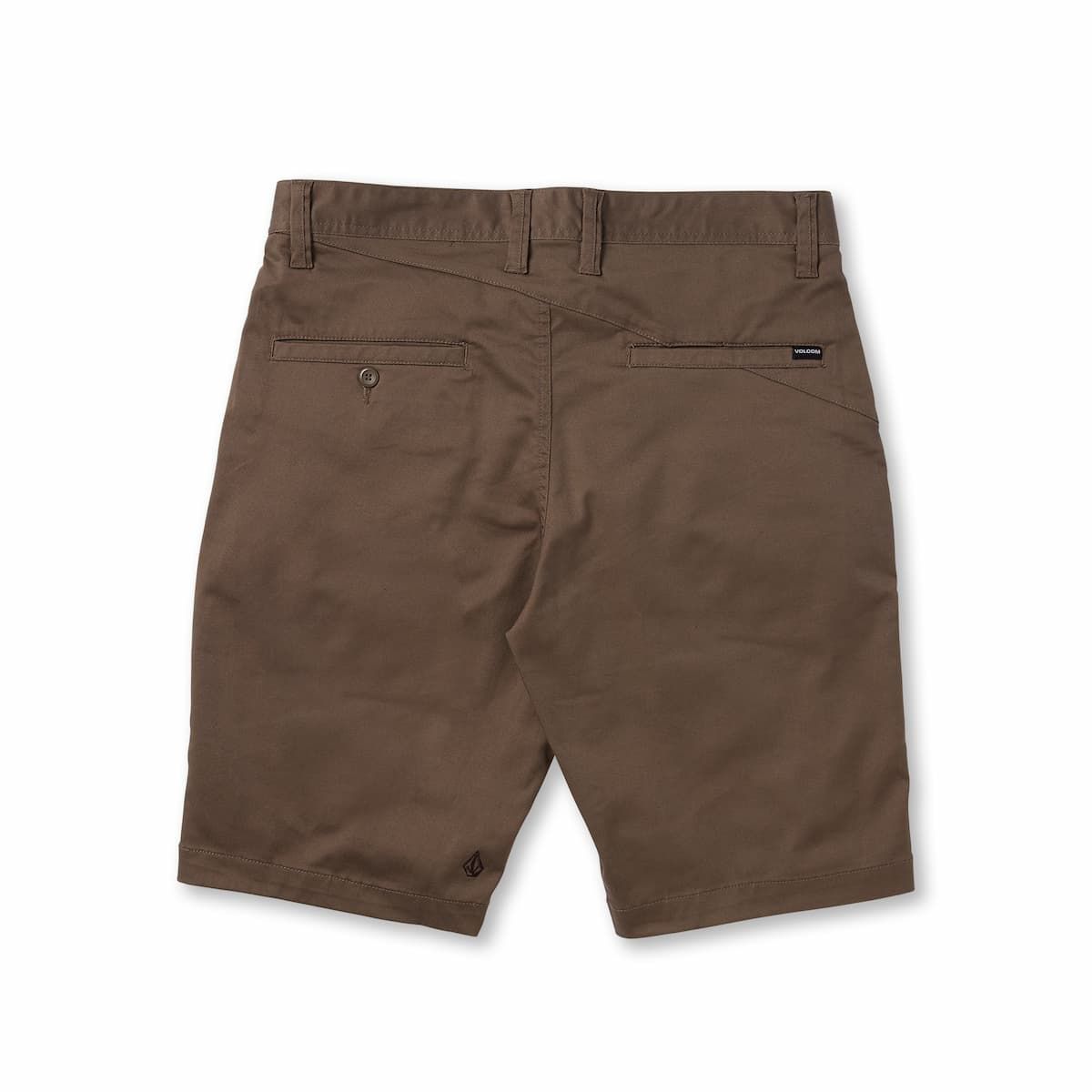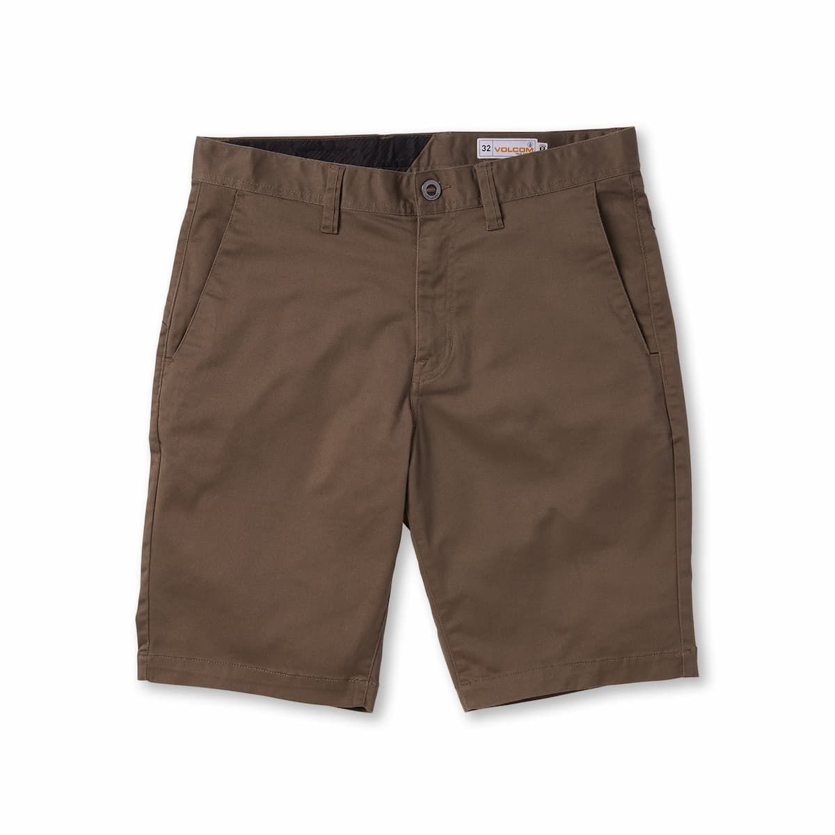 Los pantalones cortos Frickin Modern Stretch 21" Mushroom para hombre tienen una etiqueta de garantía Volcom en el interior.