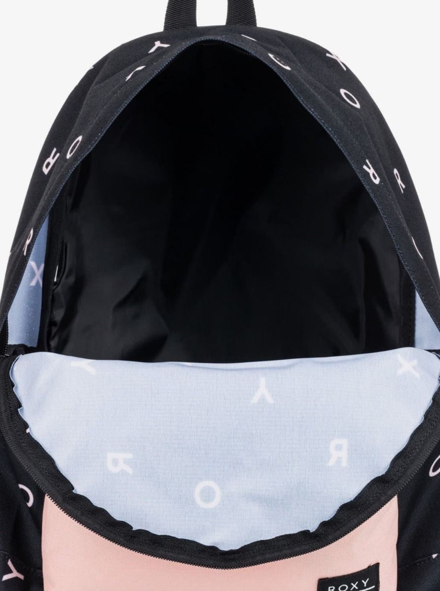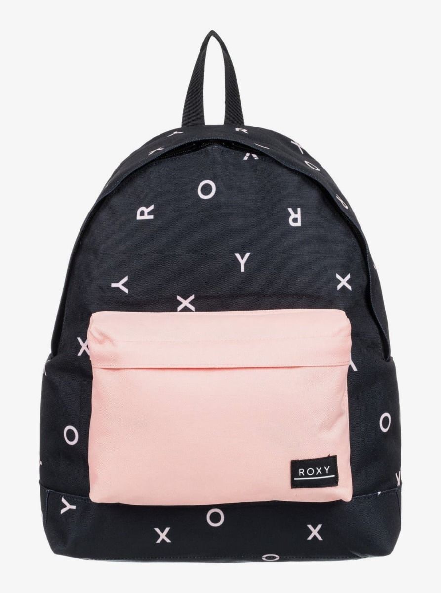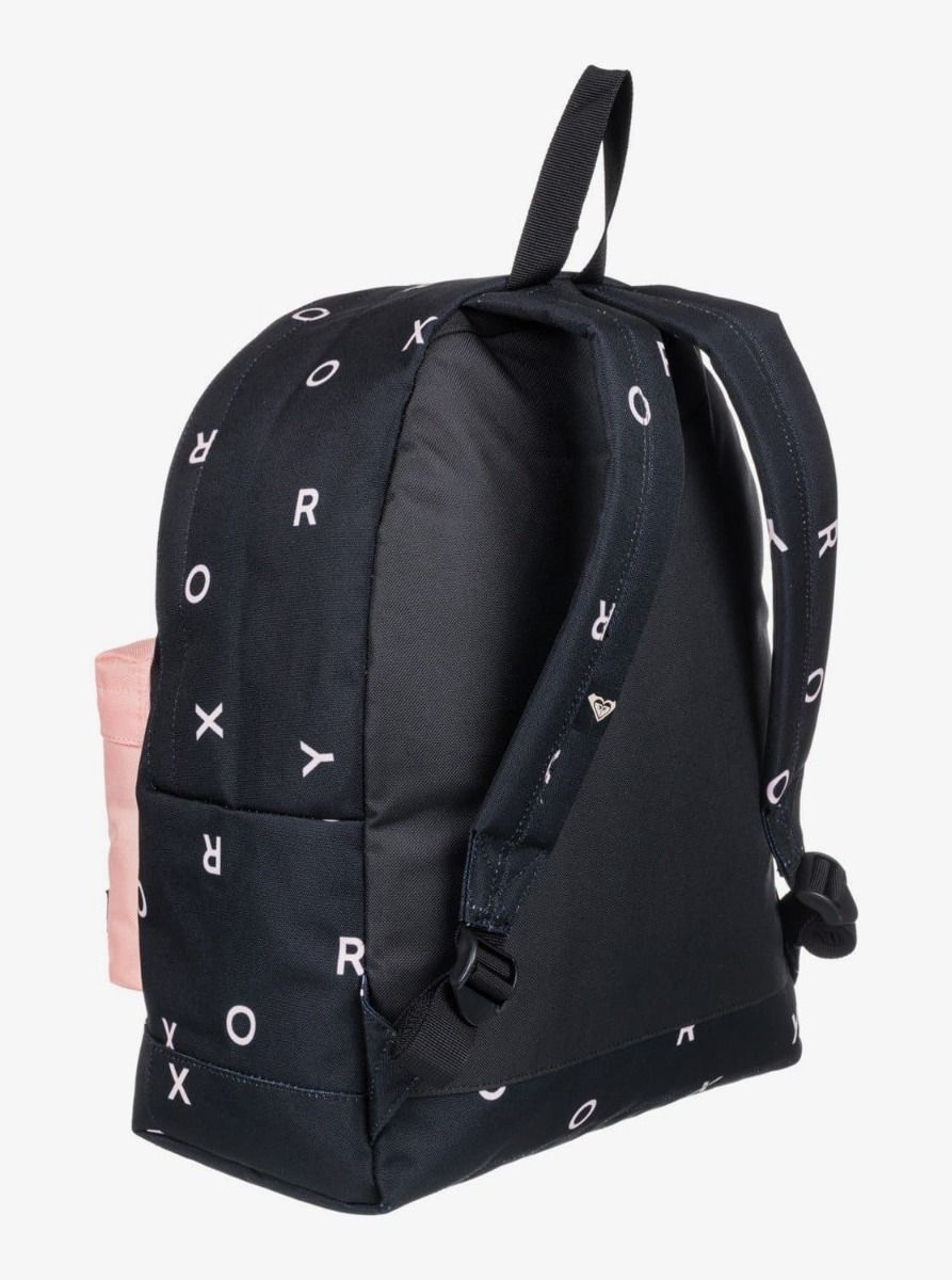 La mochila mediana Be Young 24 L de Roxy en color negro con pequeños logos de Roxy en rosa tiene un parche con el logo de ROXY en el frente.