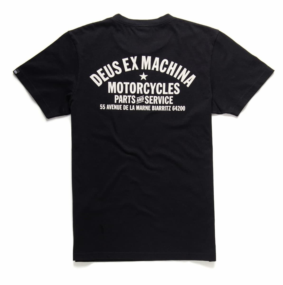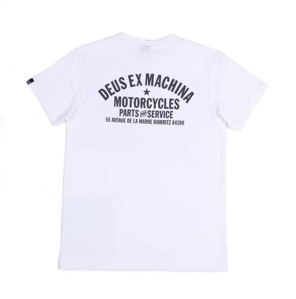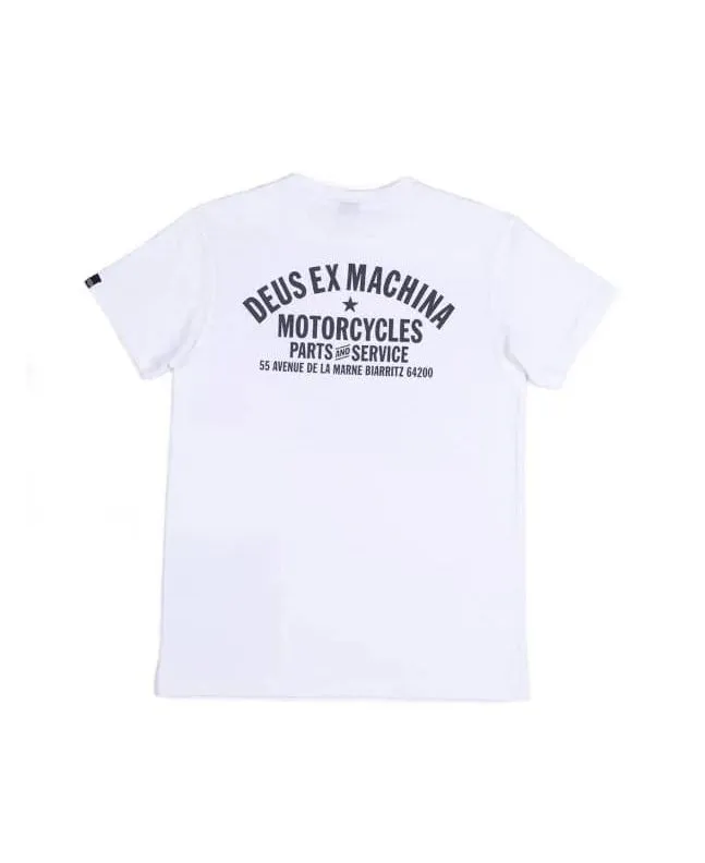 Esta camiseta de ajuste regular perteneciente a la colección de Deus Classics cuenta con cuello redondo, manga corta, impresión en el pecho con el logo de Deus y la dirección de Deus Ex Machina Biarritz en la espalda.