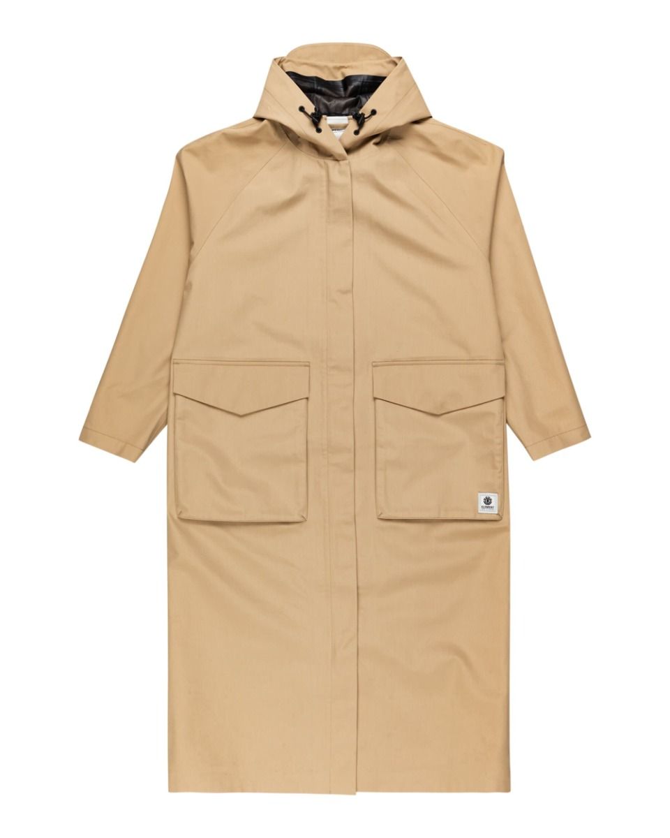 Este abrigo técnico de corte largo cuenta con capucha con cordón ajustable, cierre de cremallera y solapa, dos amplios bolsillos frontales con solapa, y un parche con el logo de Element Brand en el bolsillo.