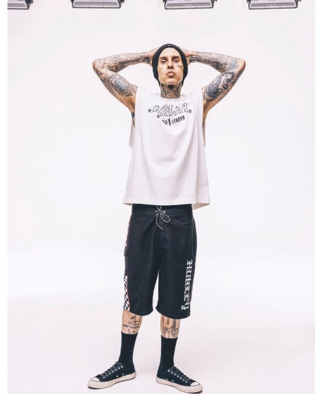 Extras: Bolsillo cargo con tirador de grosgrain, transfer Phantom y etiquetas Hurley x Travis Barker.