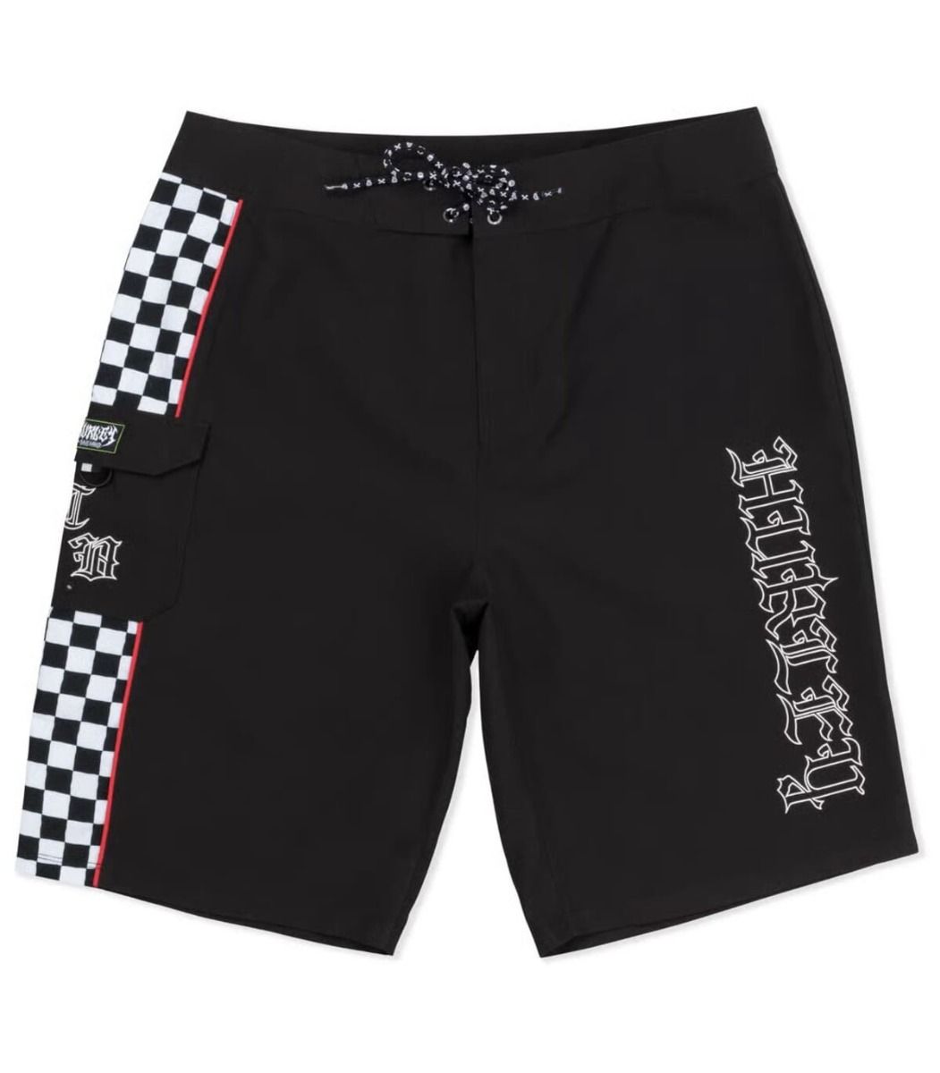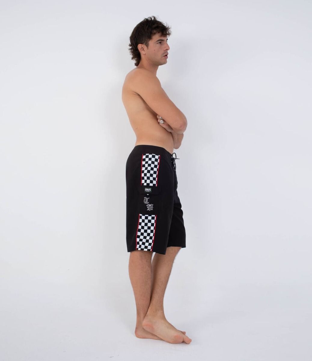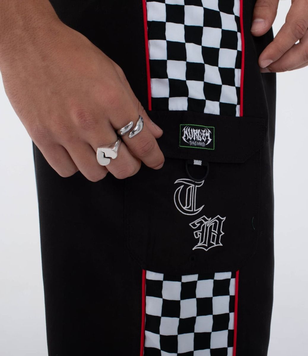 Bañador Hurley 22" en color negro con bolsillo cargo, logos bordados, estampado checker y estilo Travis Barker. Diseño atrevido y funcional.
