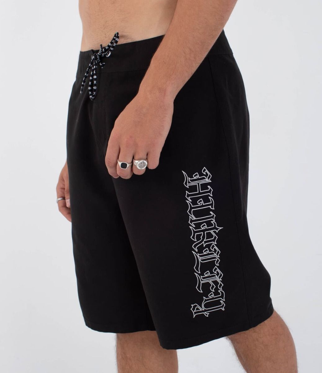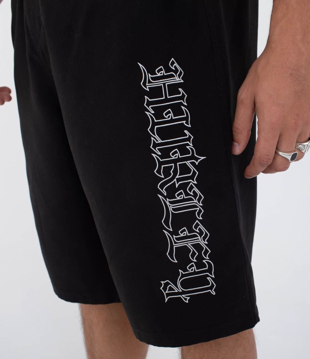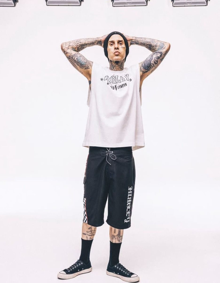 El boardshort Gothic Cargo 22" Negro no es solo una prenda de baño: es una declaración de estilo. El bolsillo cargo con cierre de velcro ofrece utilidad real en el día a día, mientras que las iniciales bordadas "T" y "B" hacen referencia directa a Travis Barker. El bordado vertical "Hurley" en estilo gótico aporta una estética dura y auténtica, ideal para quienes no se conforman con lo básico.