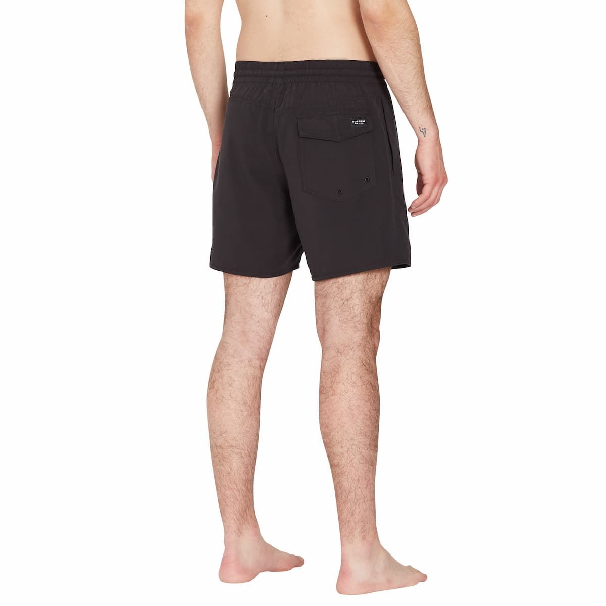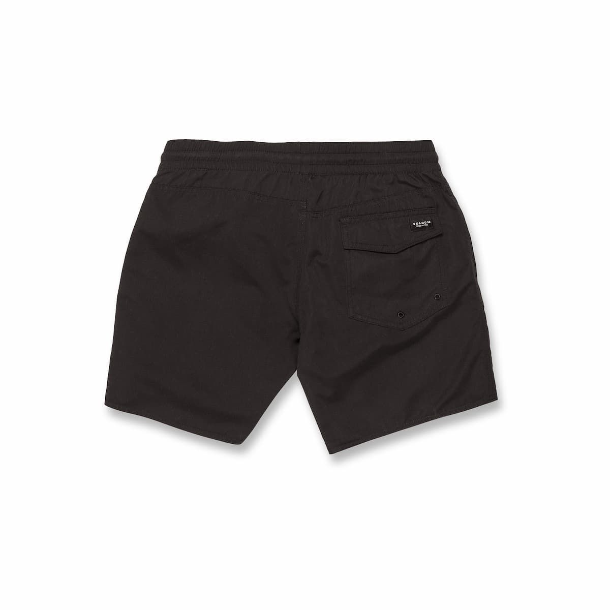 El bañador boardshort Lido Solid Trunk 16" negro para hombre tiene una etiqueta de garantía Volcom en la cintura interior.
