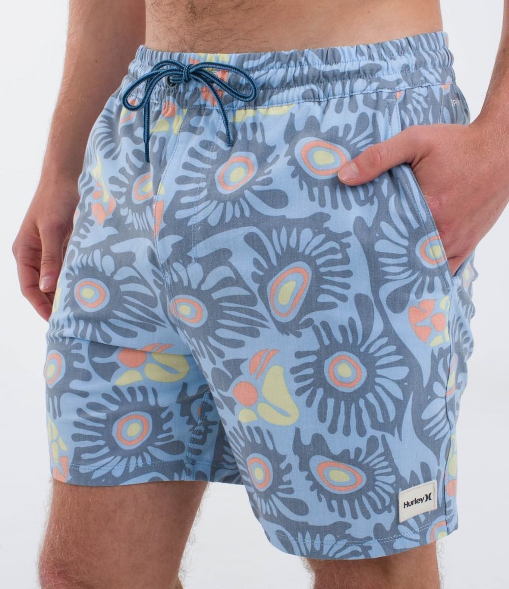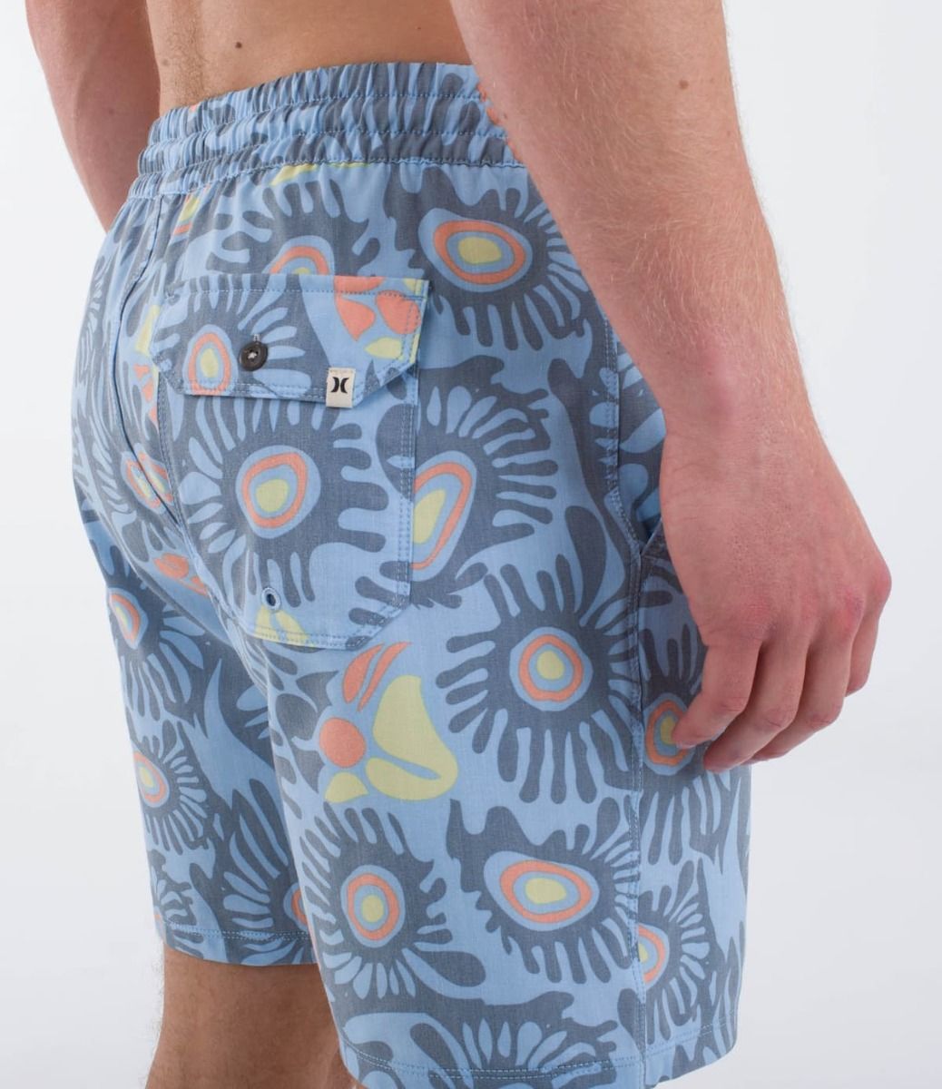 Este boardshort azul de estilo vintage viene con cintura elástica, costura exterior de 17" (43cm) con pierna recta, bolsillos laterales de malla para un drenado y secado rápido, cordón de ajuste, bolsillo posterior con botón, agujero de drenaje y cordón para llaves, el sello Phantom en la cintura y un parche de algodón orgánico Hurley One and Only tejido en la pierna izquierda.