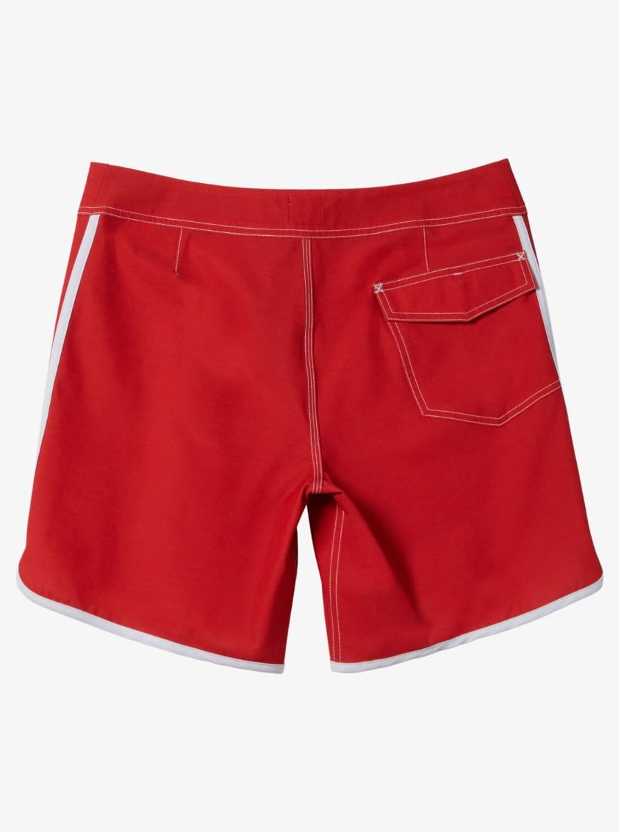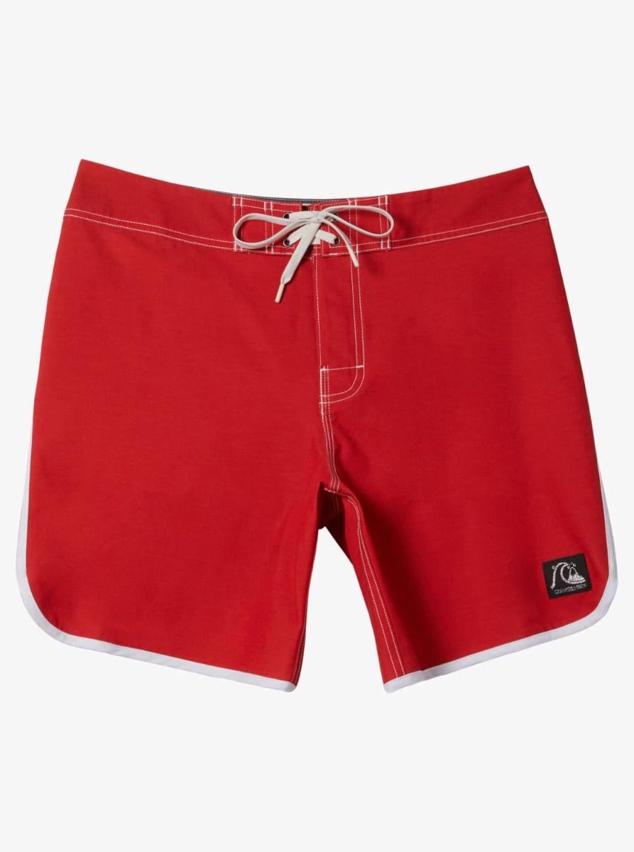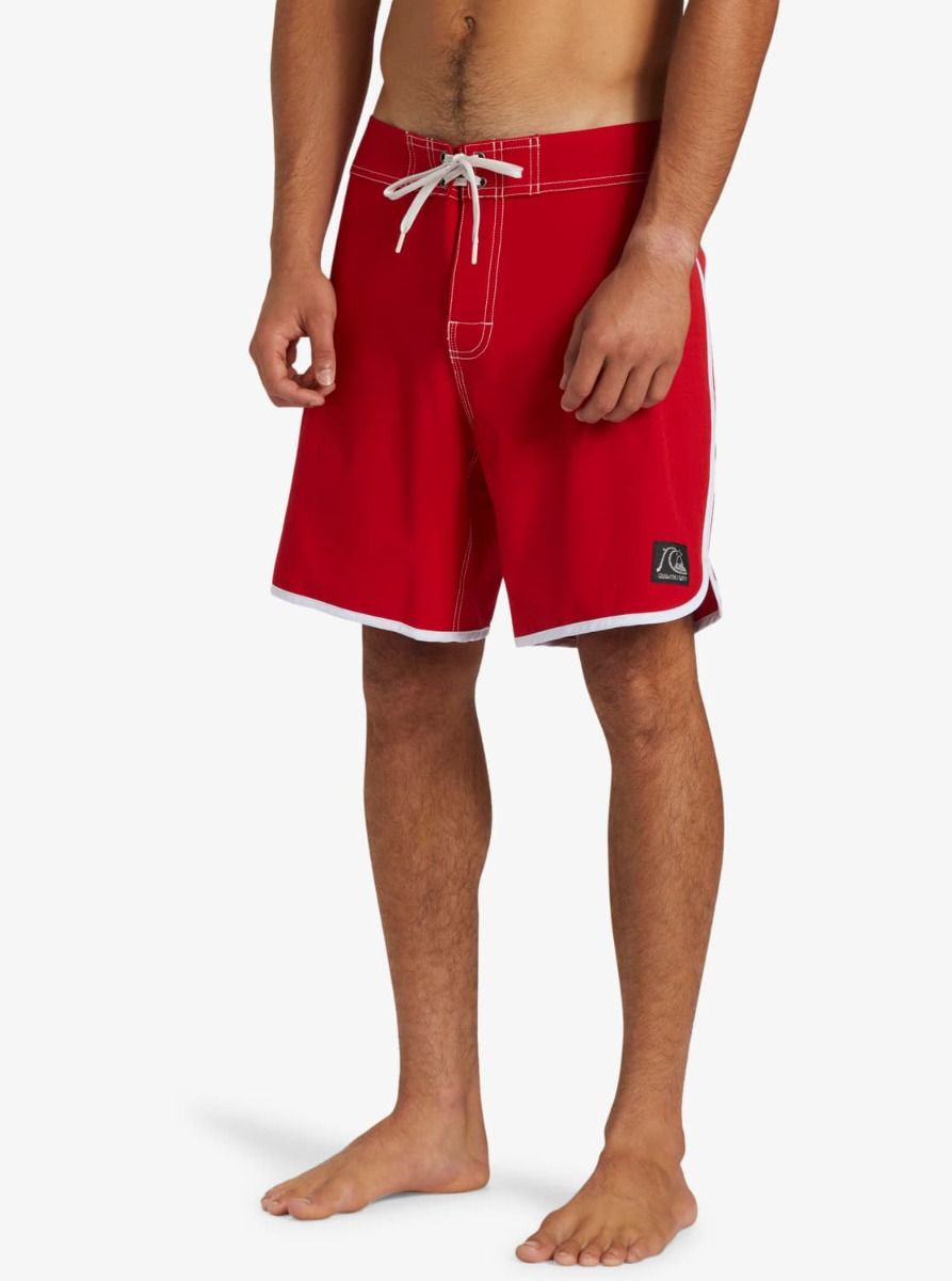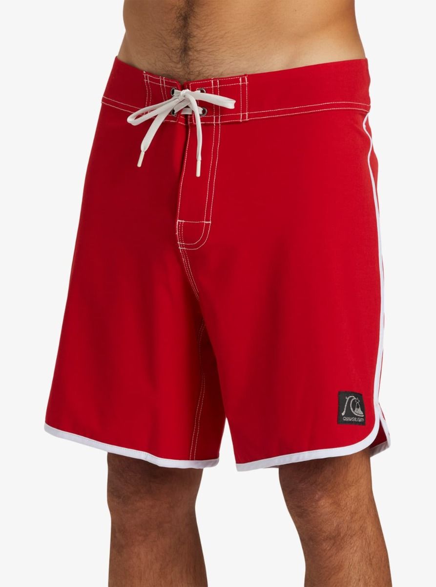 Este bañador de surf rojo con bajo festoneado cuenta con longitud de 18" (45,7cm), tejido con recubrimiento hidrofóbico a base de plantas que repele el agua, cintura fija con cierre de cordón ajustable, bragueta performance, bolsillo posterior con solapa y cierre autoadherente, un cordón elástico para llaves en el interior del bolsillo y un pequeño parche de tela con el logo original de Quiksilver tejido en la pierna izquierda.