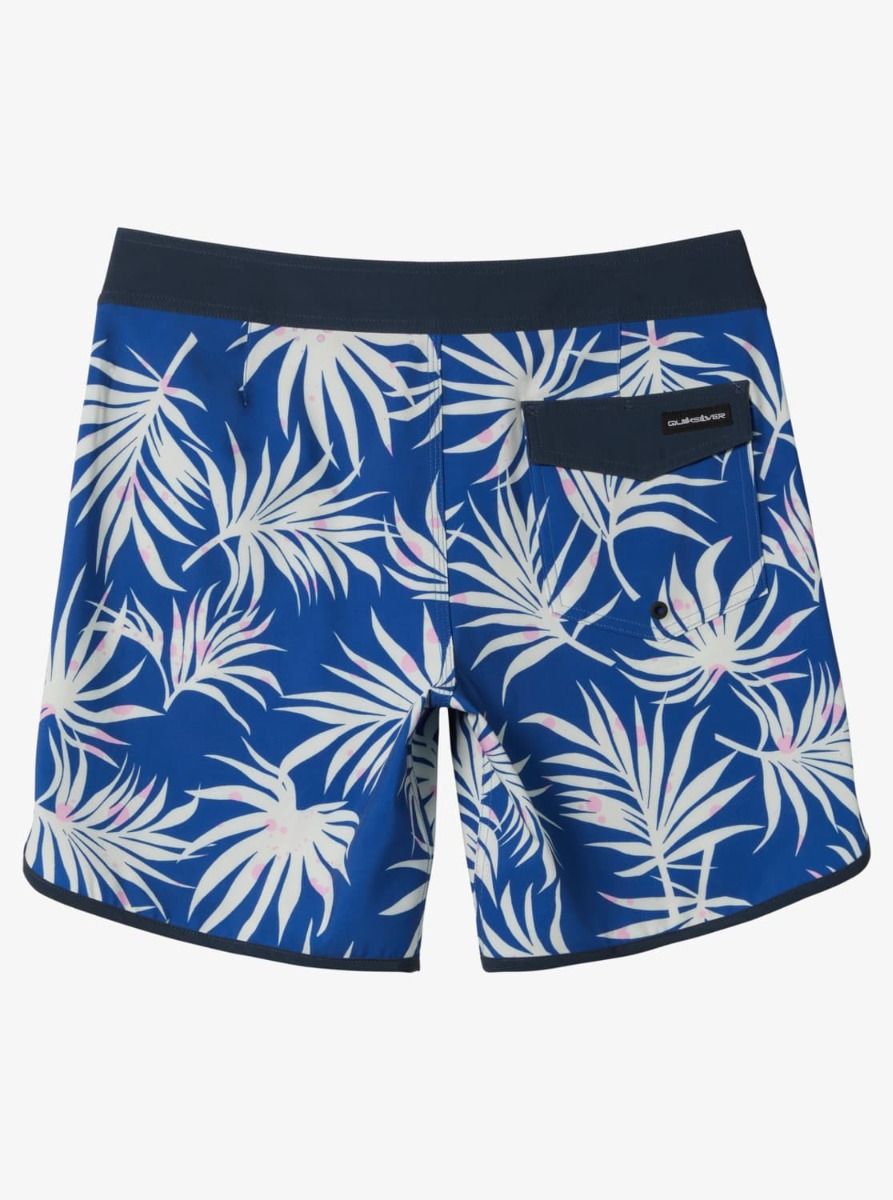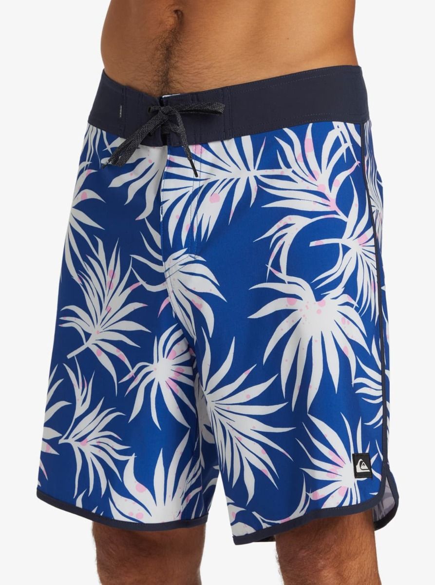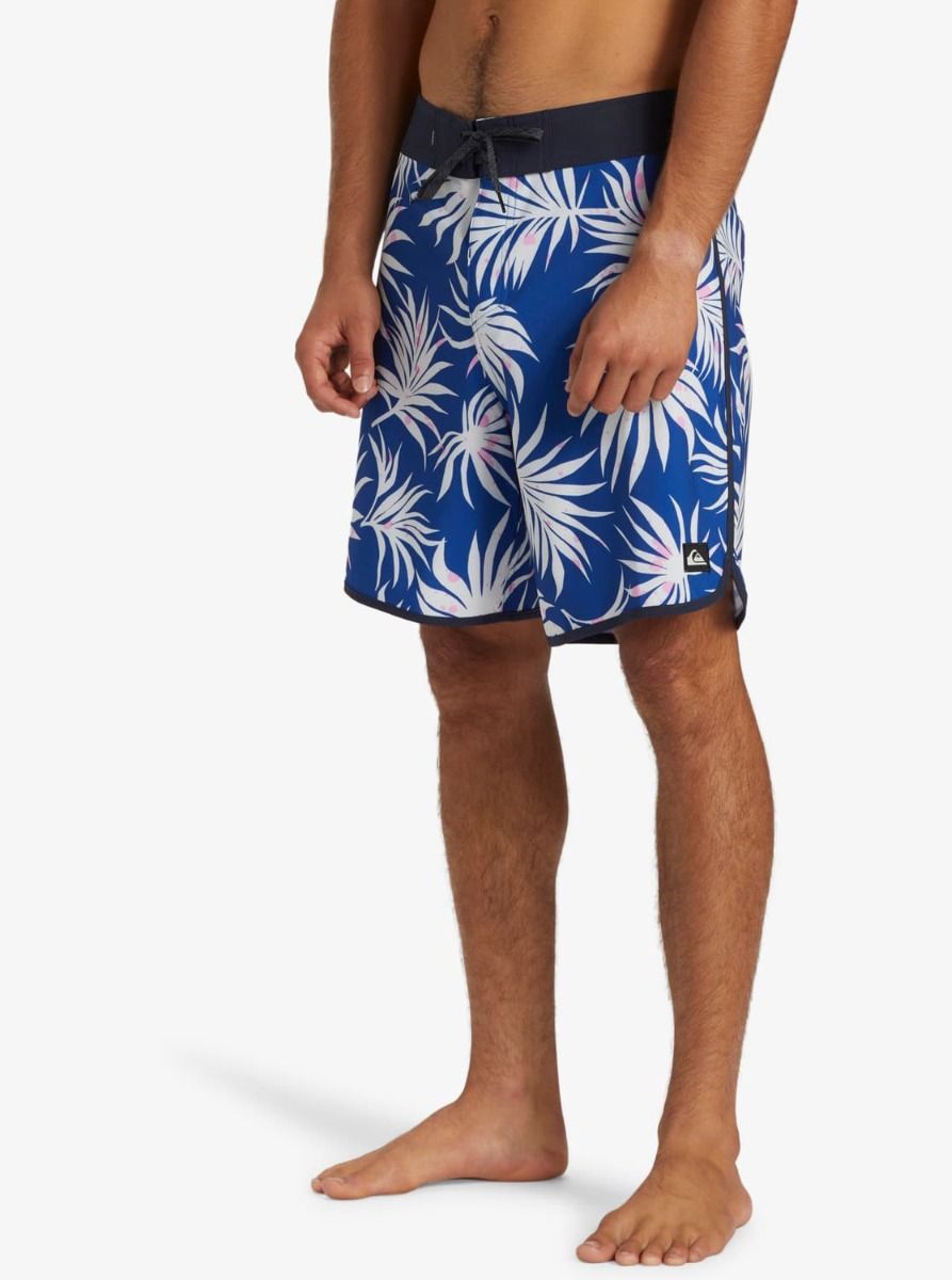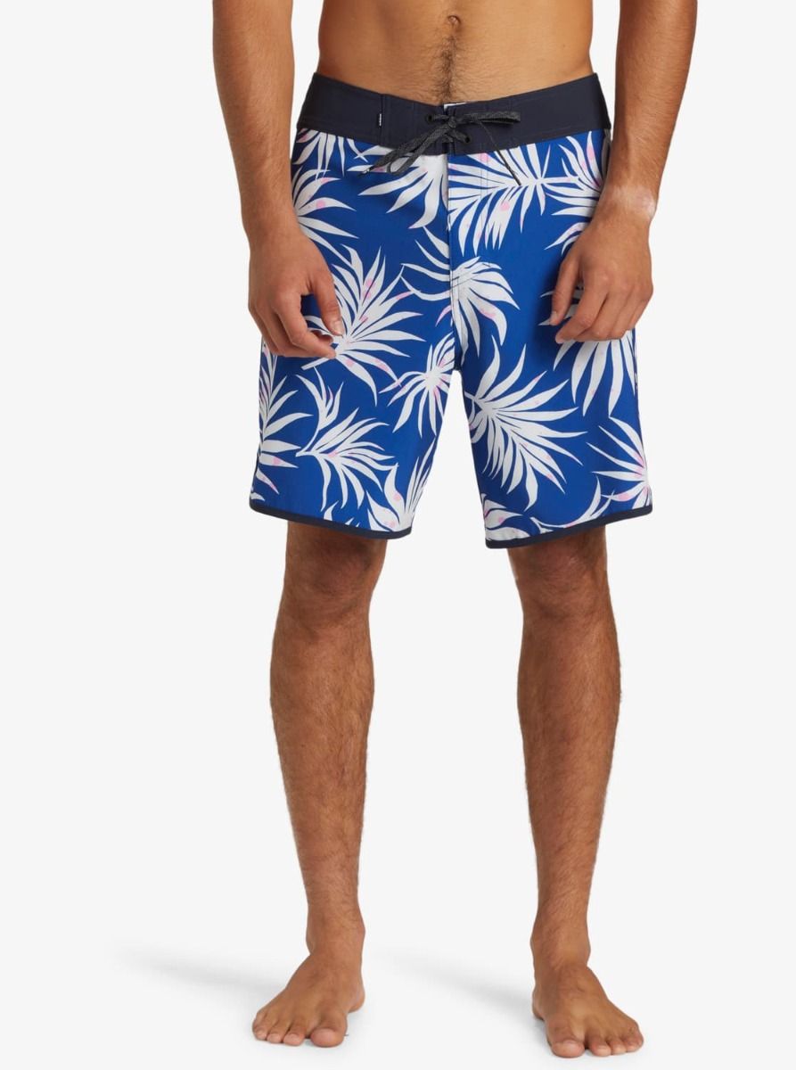 Este bañador de surf azul con bajo festoneado cuenta con longitud de 18" (45,7cm), recubrimiento hidrofóbico a base de plantas, cintura fija con cierre de cordón ajustable, bragueta performance, bolsillo posterior con solapa y agujero de drenaje, un cordón elástico para llaves en el interior del bolsillo, estampado tropical y un pequeño parche de tela con el logo clásico de la ola y la montaña de Quiksilver tejido en la pierna izquierda.