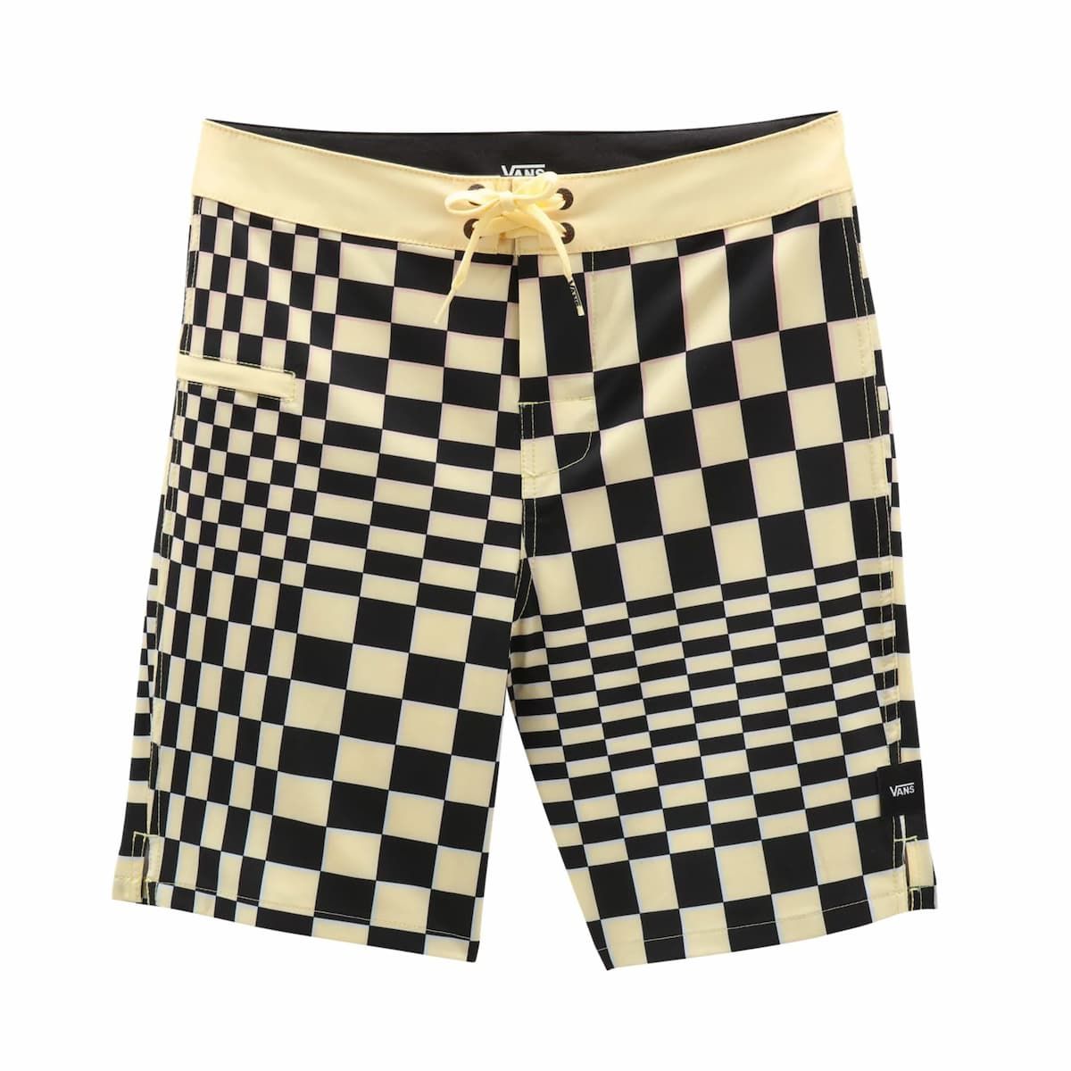 El bañador Skewed Checkerboard amarillo para niño tiene una etiqueta de Vans tejida en la pierna izquierda.