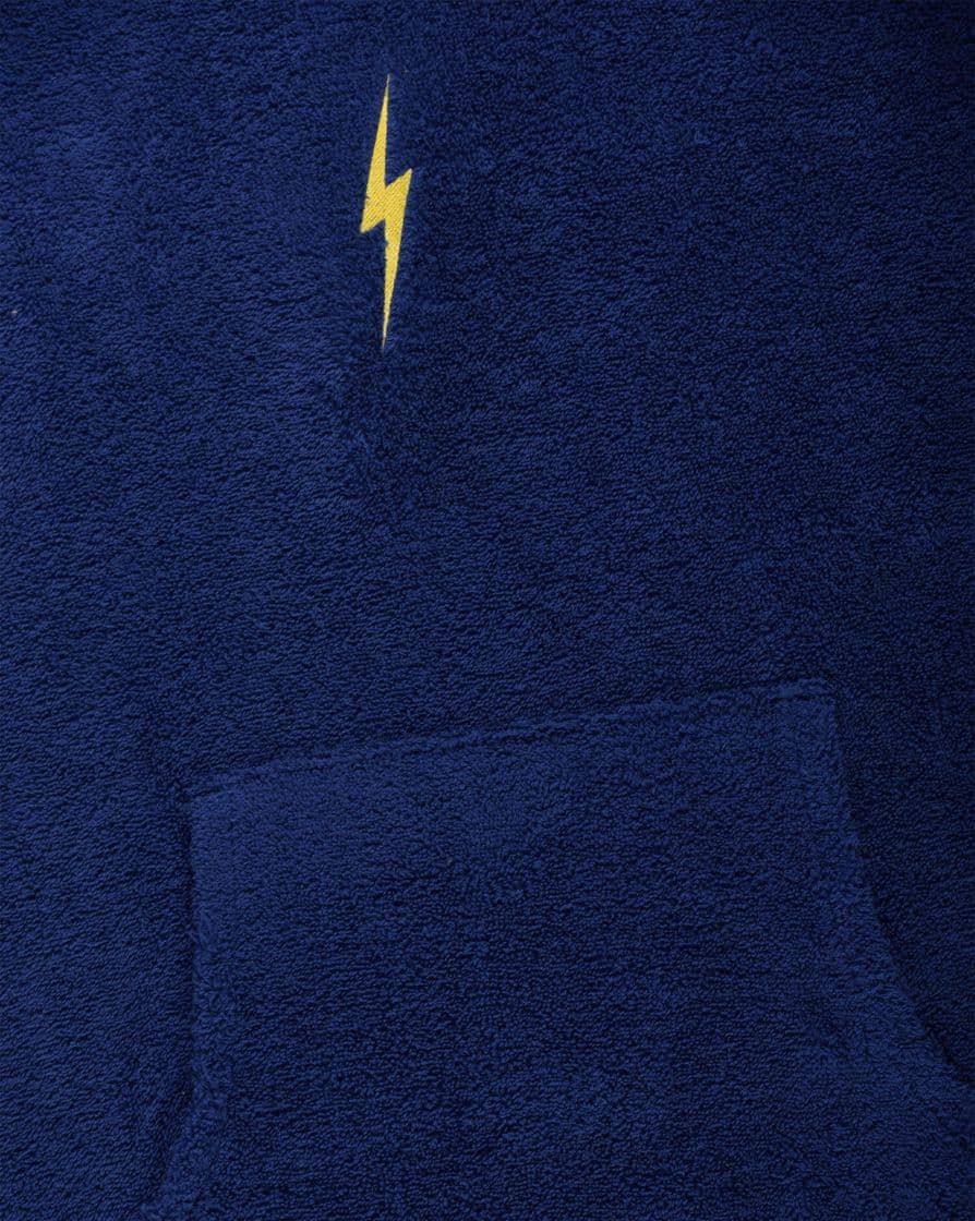 La toalla con capucha Unisex Bolt Poncho azul tiene el sello de garantía Lightning Bolt en el interior.