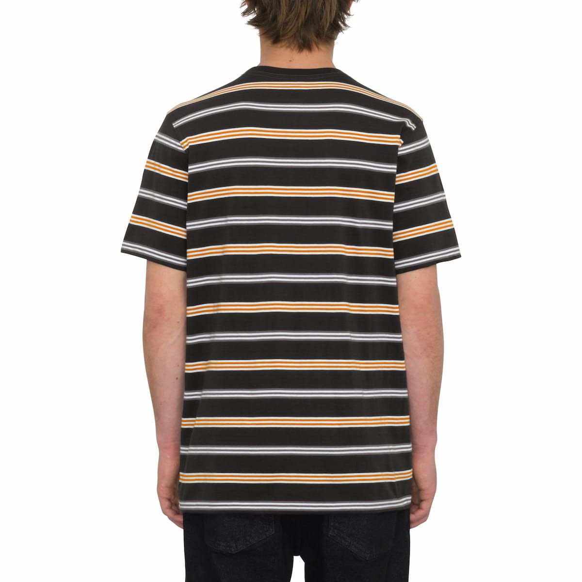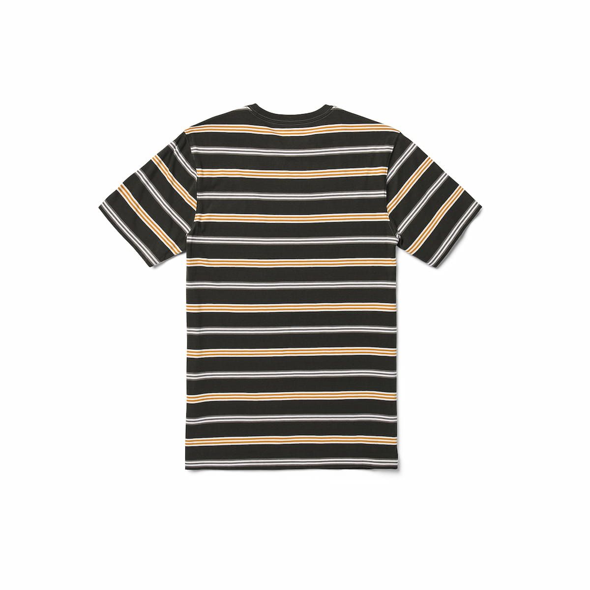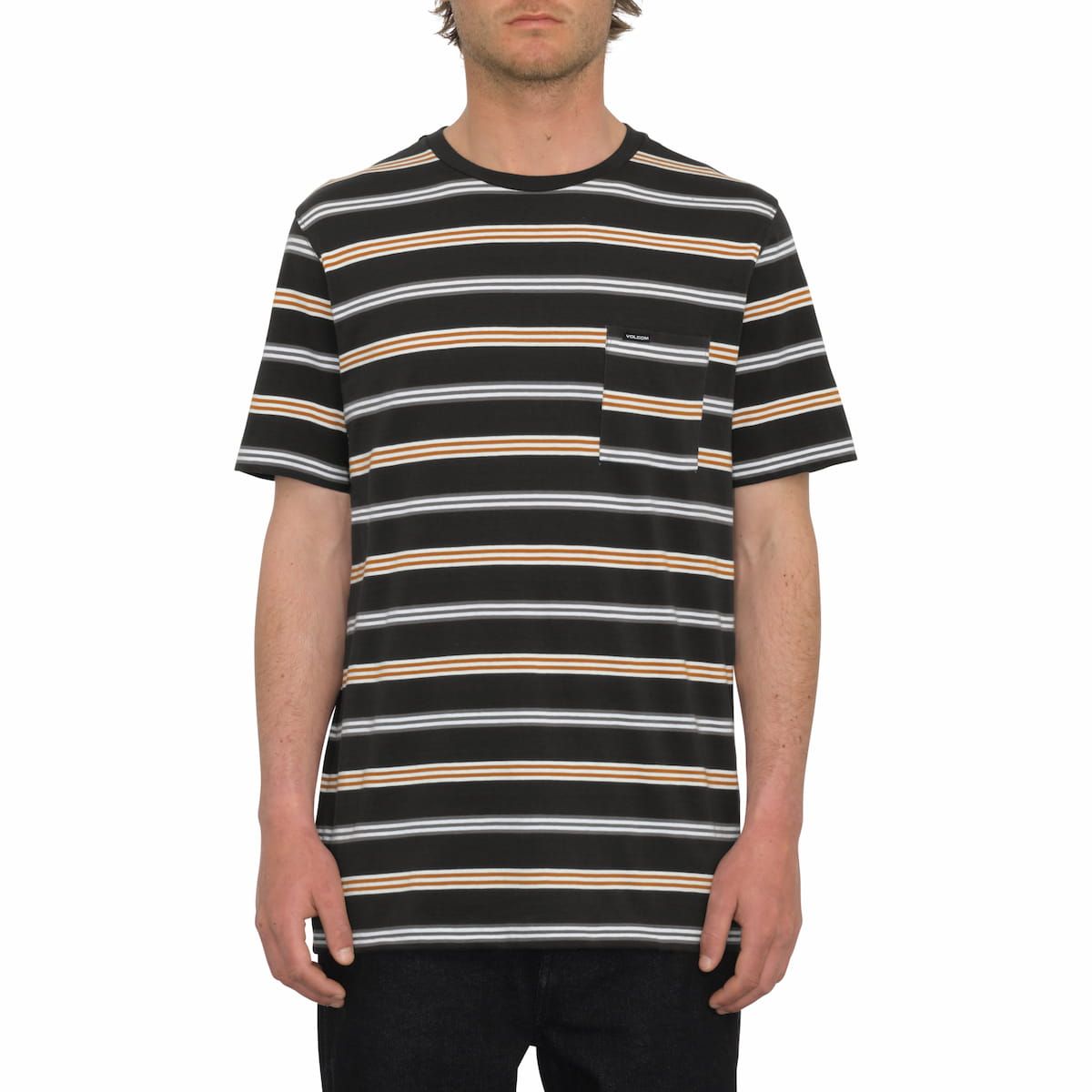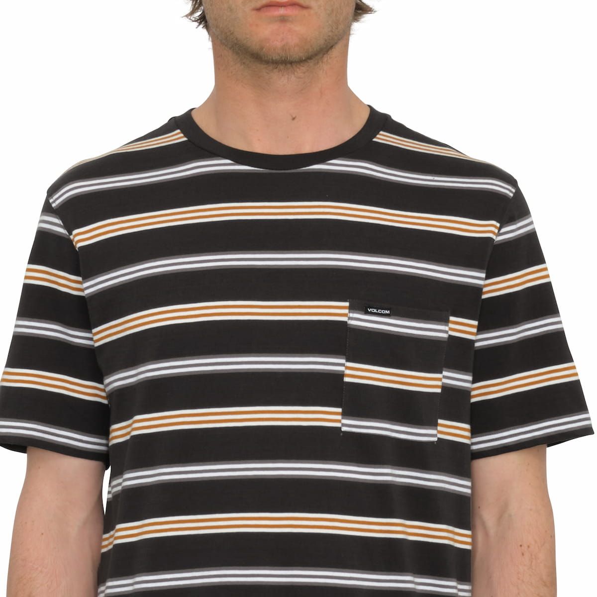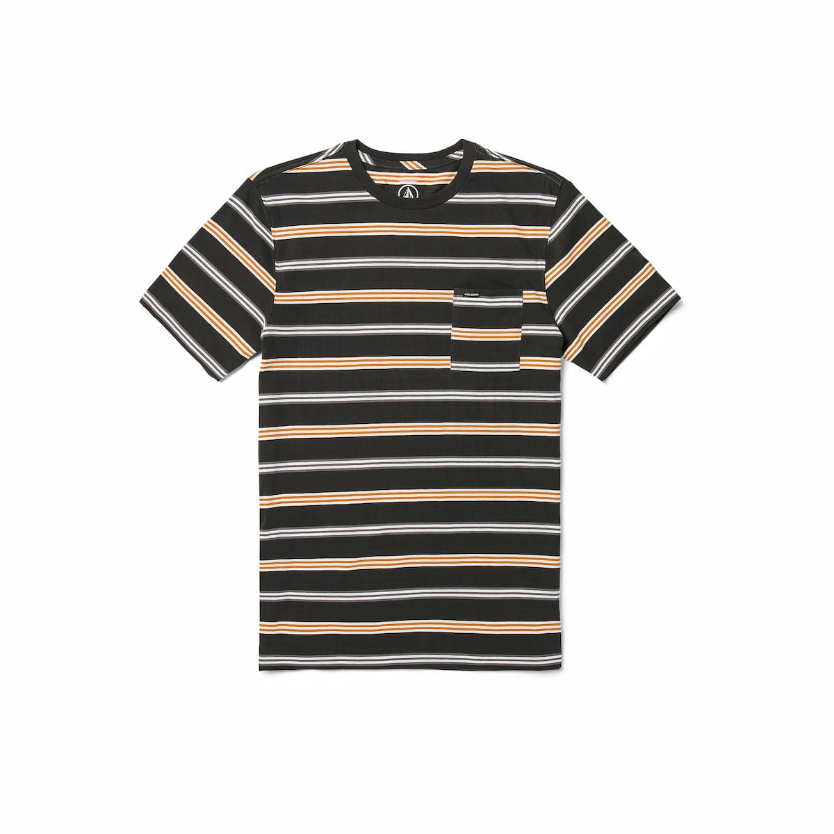 Este camiseta de corte moderno cuenta con cuello redondo, manga corta, estampado a rayas, bolsillo en el pecho, tira en el cuello y una etiqueta Volcom tejida en el bolsillo.