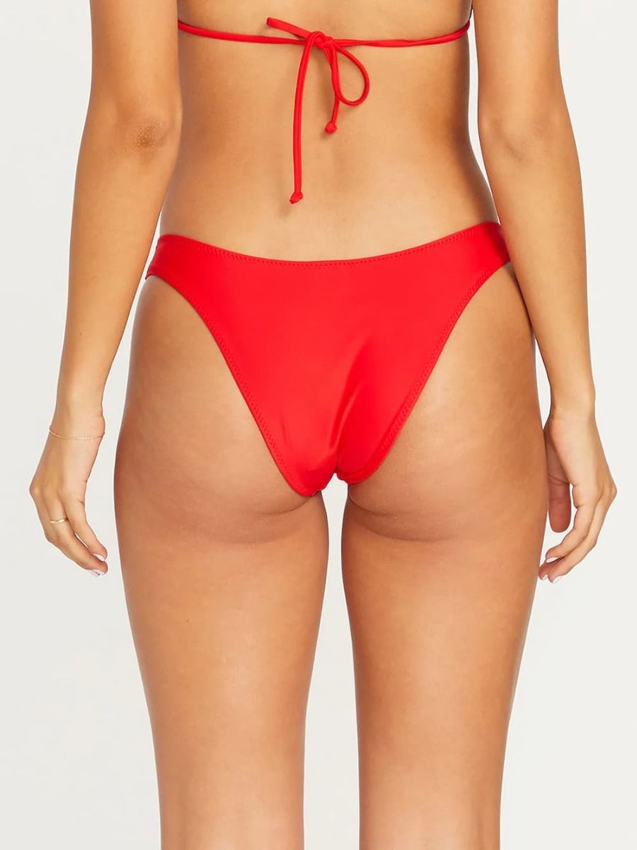La braguita de bikini Simply Solid V Candy Apple cuenta con un corte atrevido y una discreta insignia metálica con el logo de Volcom en la zona posterior de la cadera derecha.