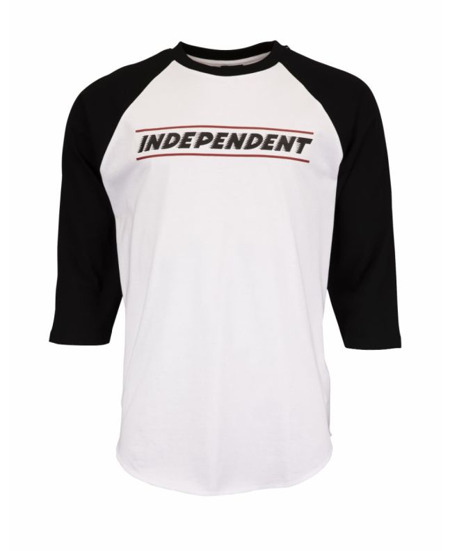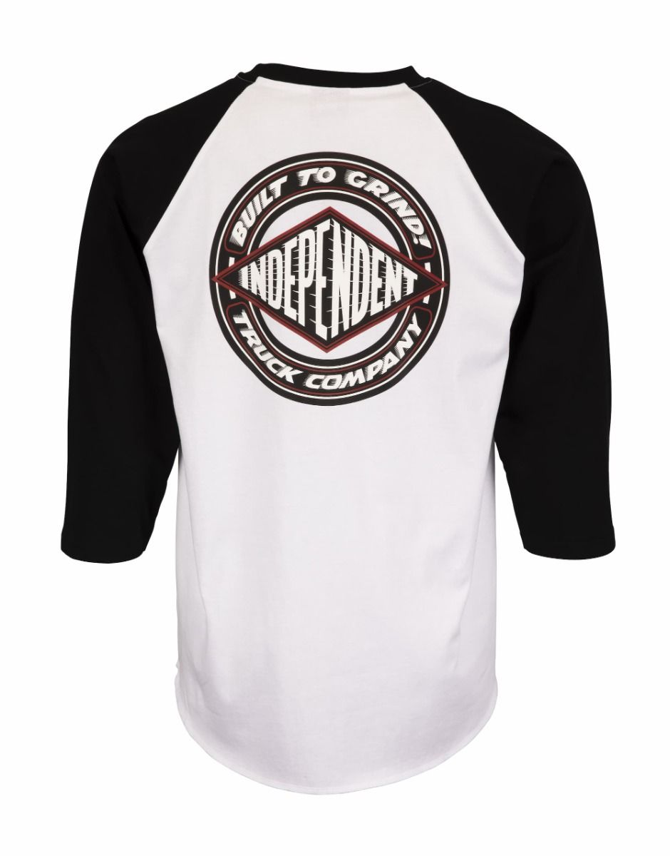 Este top de bésibol de ajuste relajado cuenta con cuello redondo, mangas raglán ¾ en contraste y el logo de Independent Truck Company serigrafiado en el pecho y en la espalda.