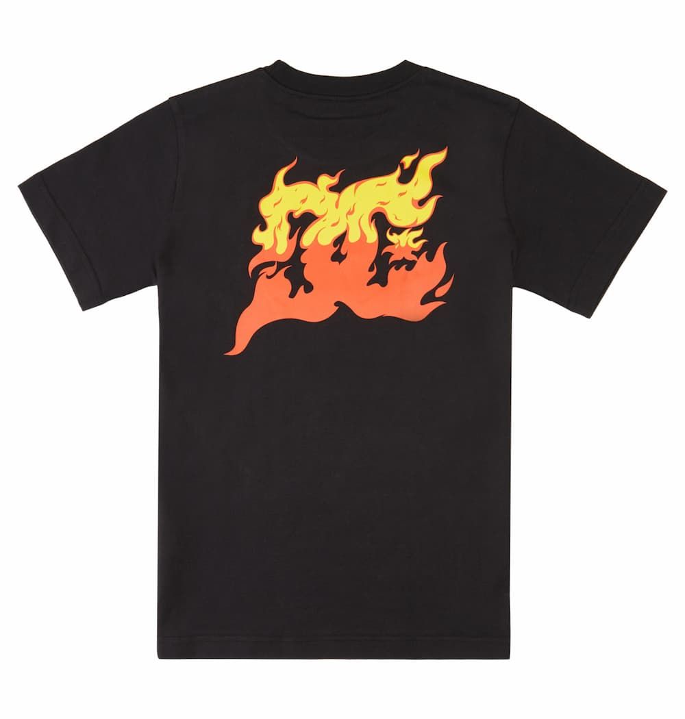 Esta camiseta de corte clásico cuenta con cuello redondo, manga corta y el logo de DC en llamas estampado en la parte izquierda del pecho y en la espalda, y una etiqueta de la marca cosida en el dobladillo.