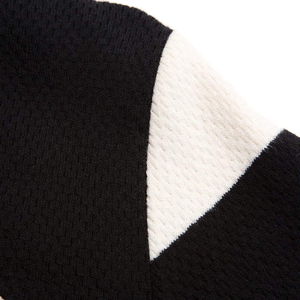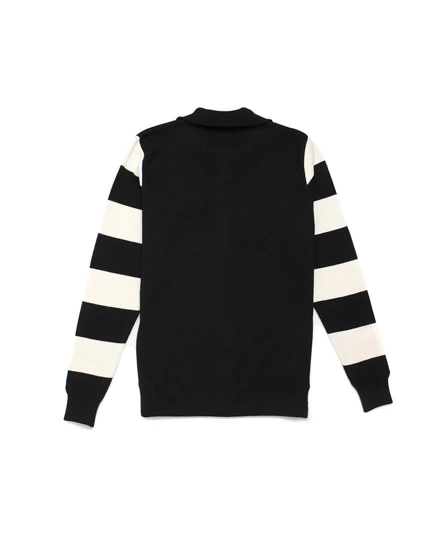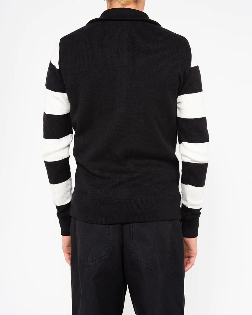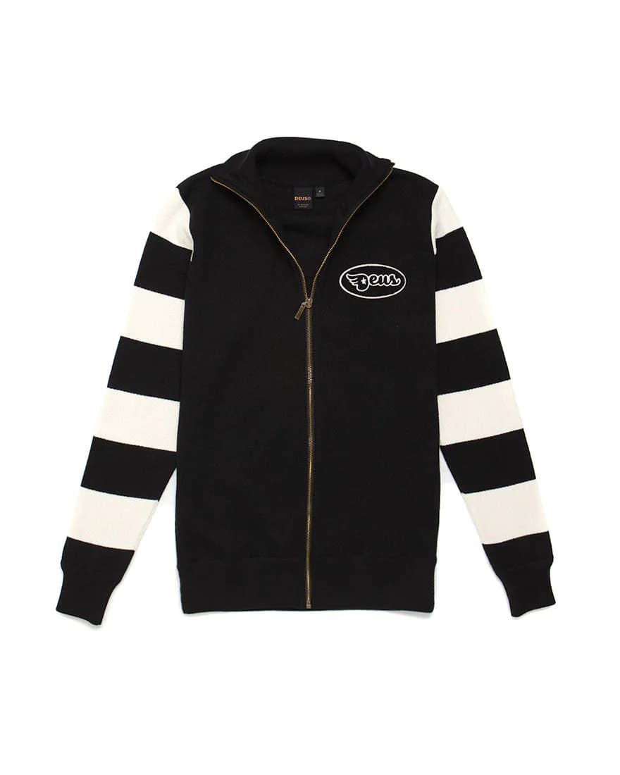 Esta chaqueta de punto cuenta con ajuste regular, cierre frontal de cremallera, mangas blancas y negras, puños y dobladillo inferior acanalados y un parche de fieltro con bordado Deus en el lado izquierdo del pecho.