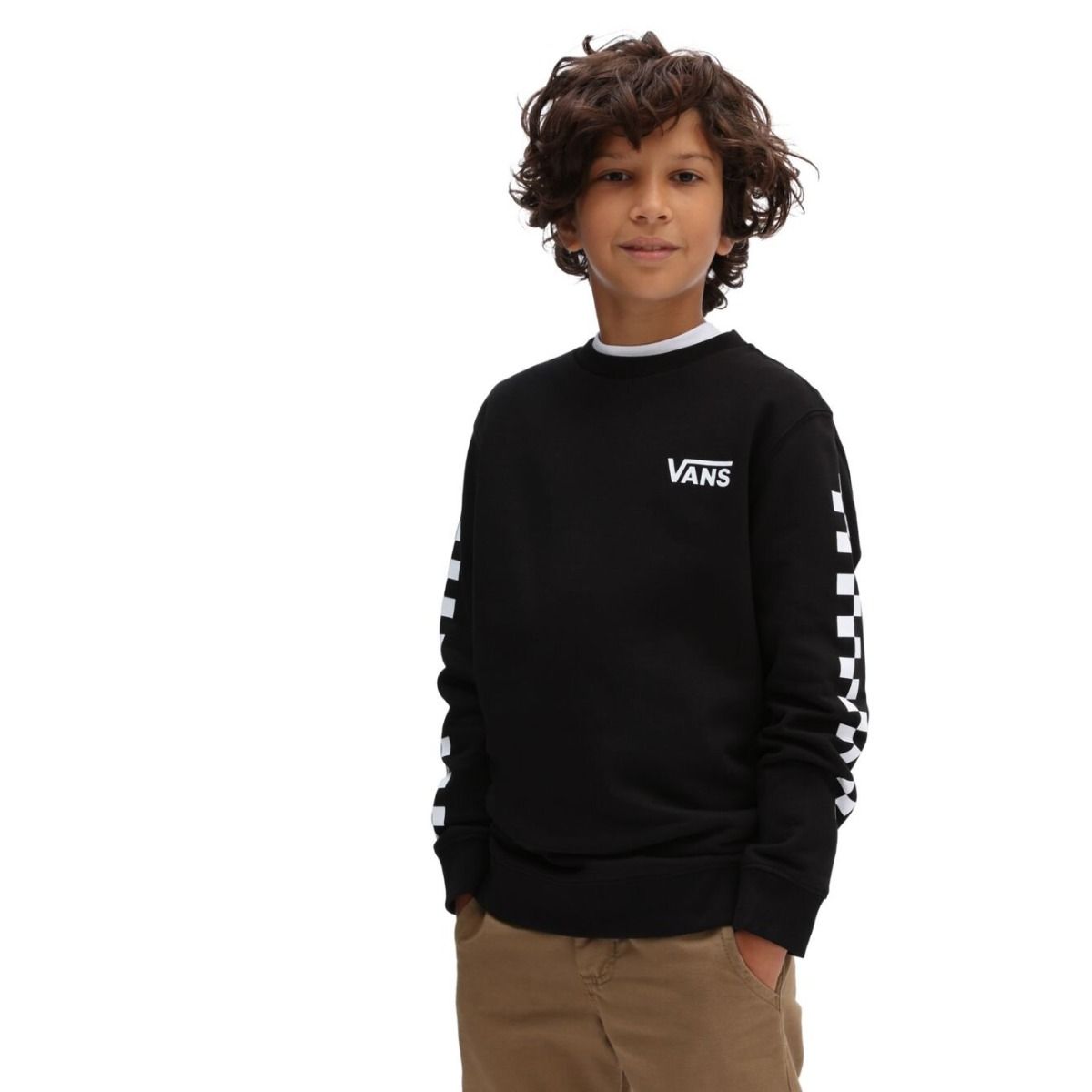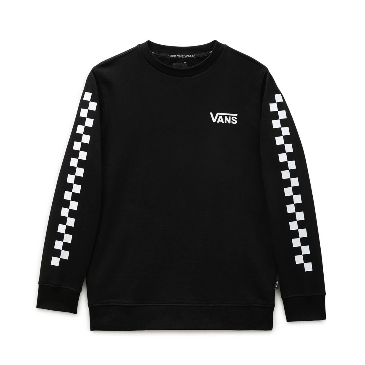 Este crew cuenta cuello redondo, punto canalé en puños y parte inferior y estampados originales Checkerboard Vans en las mangas.