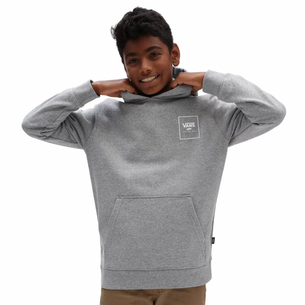 La sudadera con capucha para chicos de entre 8 y 14 años By Print Box Back gris tiene una etiqueta de Vans cosida en el cuello interior.