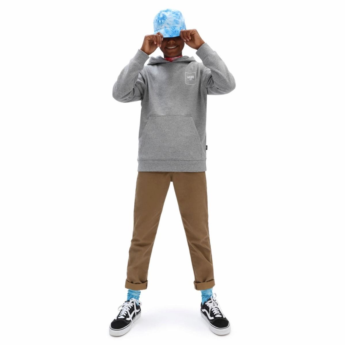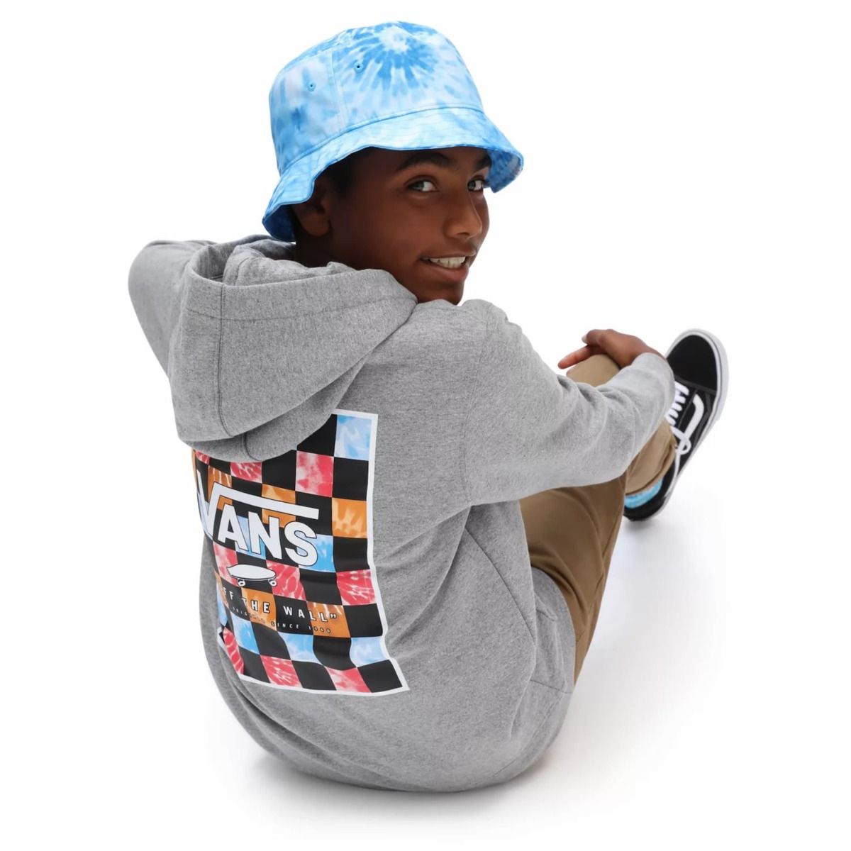 La sudadera con capucha para chicos de entre 8 y 14 años By Print Box Back de Vans en gris con estampado a cuadros en Tie Dye (Cement Heather-Tie Dye Block) ha sido confeccionada con 65% de algodón y 35% de poliéster.