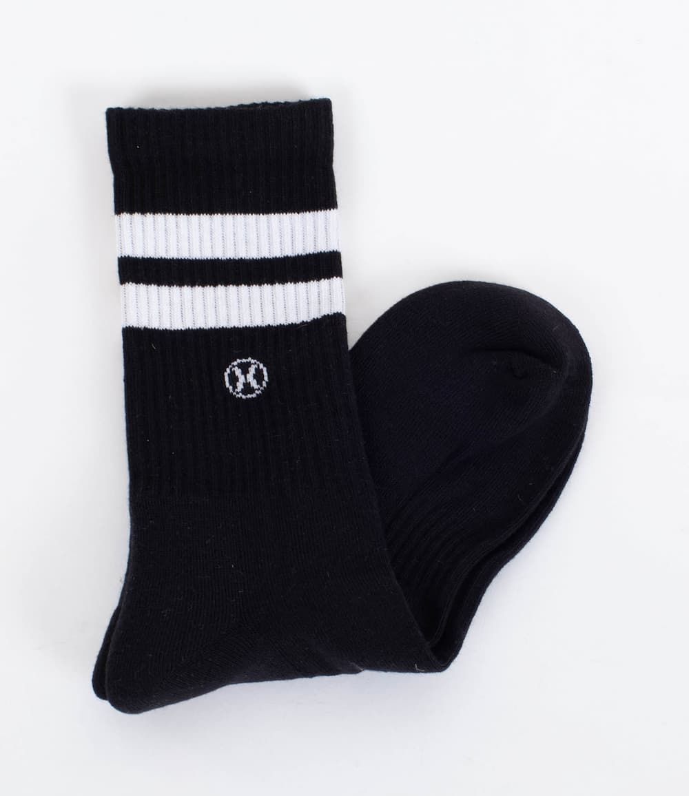 El corte a un cuarto de caña y su confección en canalé elástico permiten un ajuste firme sin apretar. Las dos rayas blancas aportan un guiño retro que remata un look limpio, práctico y cómodo. Ideales para llevar con zapatillas low-top o mid-top, y lo bastante cómodos para usarlos durante todo el día.