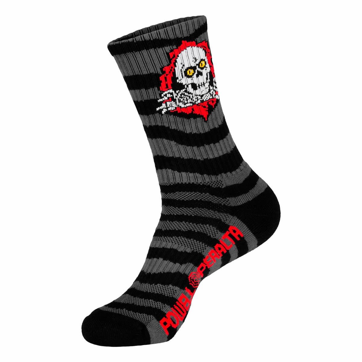 Calcetines Powell Peralta Ripper Stripes color gris carbón y negro, acolchados y transpirables, ideales para skate y uso diario.