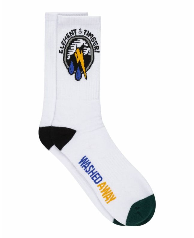 Estos calcetines deportivos de perfil alto, pertenecientes a la Colección Washed Away de Timber! y Element Brand, cuentan con almohadillado ligero, galga pequeña con punto antihumedad, estampado de jacquard en contraste y un diseño exclusivo del artista Chad Eaton (AKA Timber!), junto con la inscripción "Washed Away" (Arrasado) bordados.