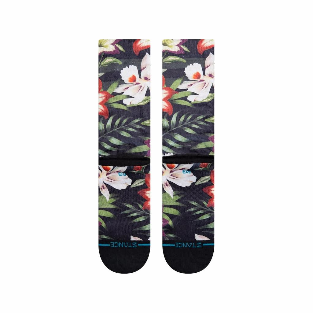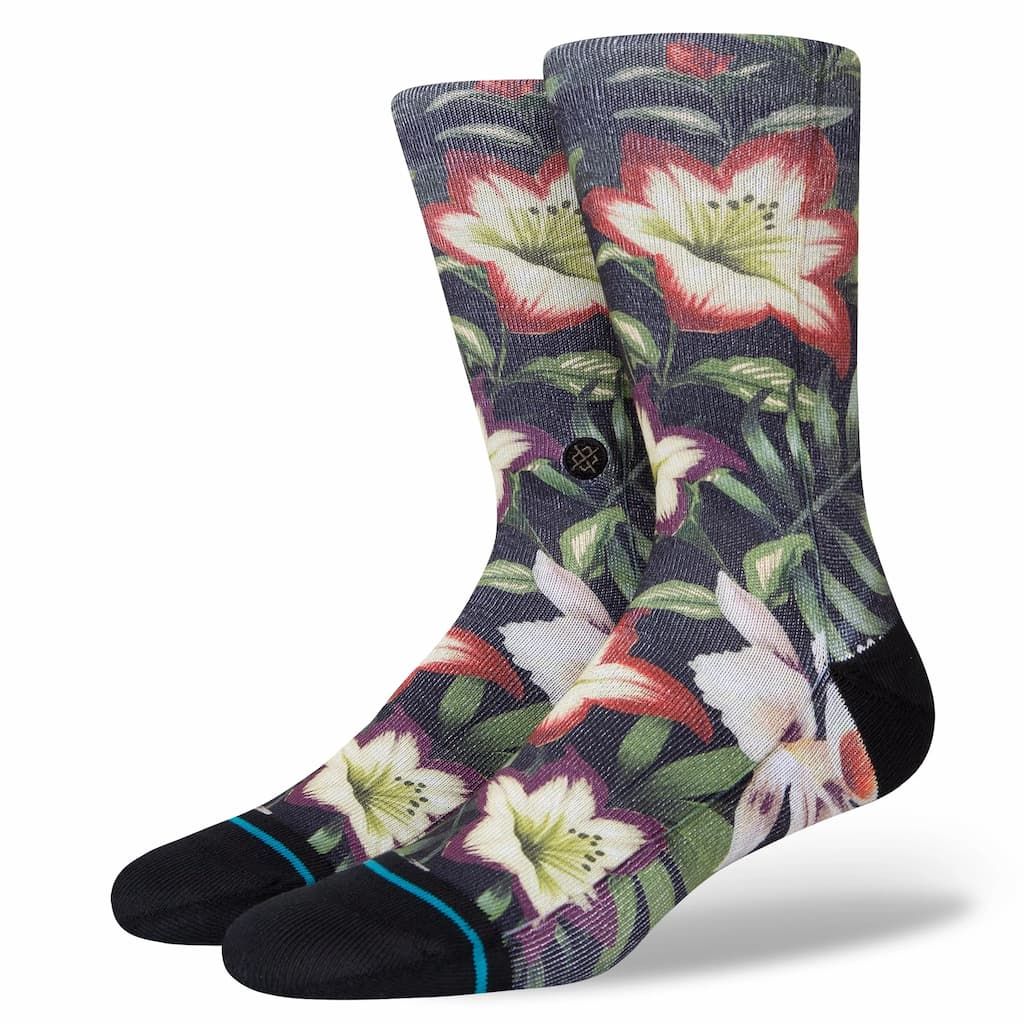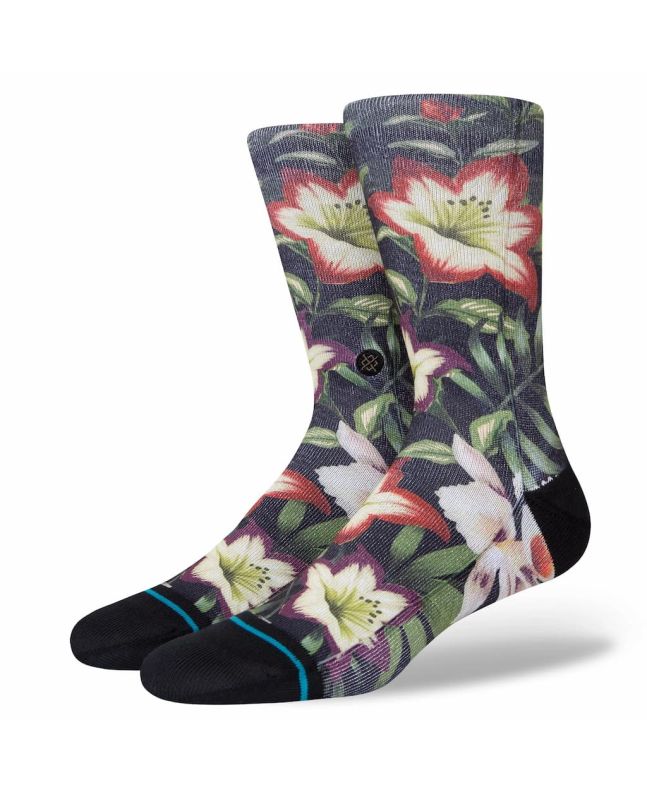 Los calcetines para hombre y mujer Variegate Crew Sock en negro con estampado floral (Black) de Stance están confeccionados con 73% poliéster, 21% algodón peinado, 4% nailon y 2% elastano.