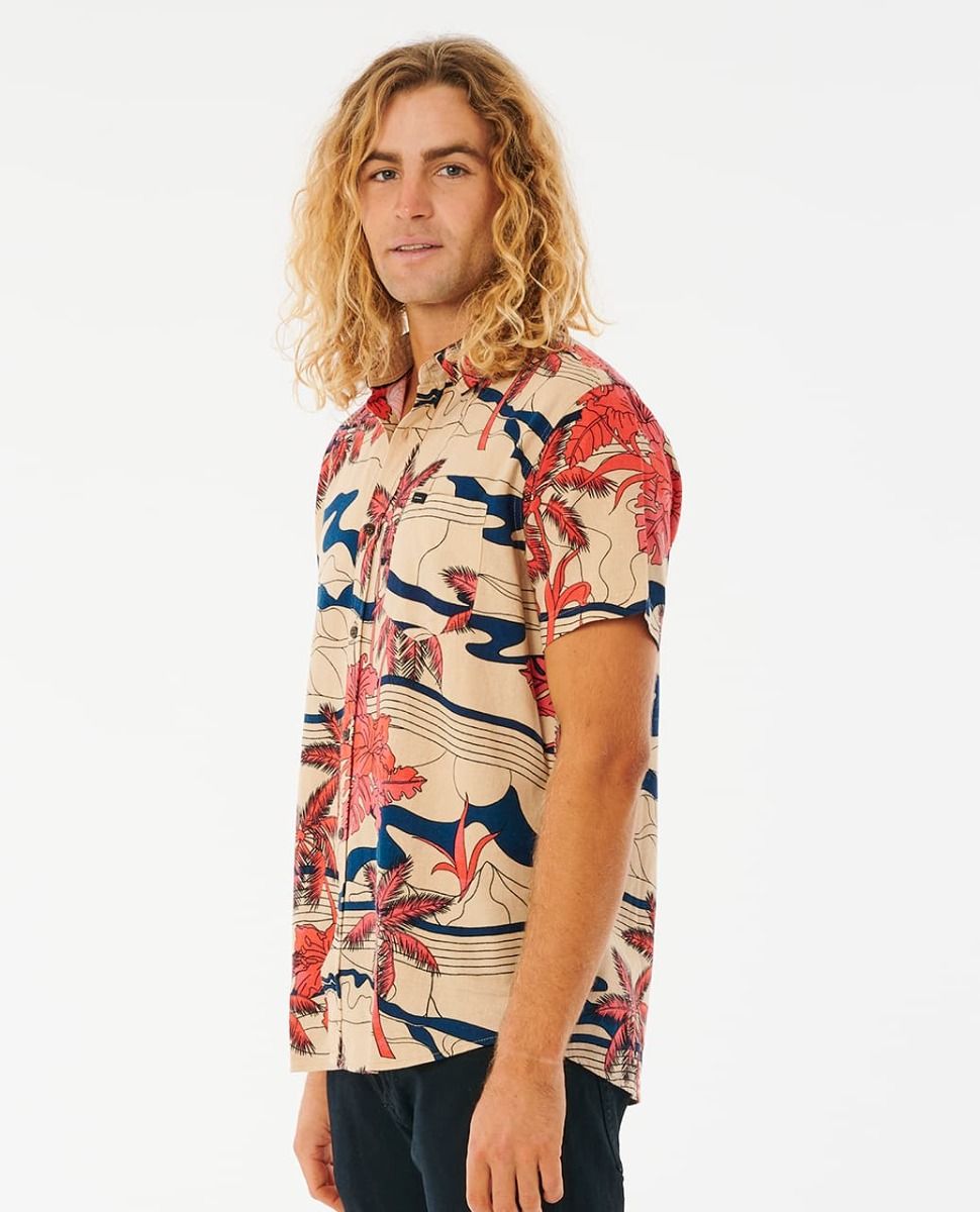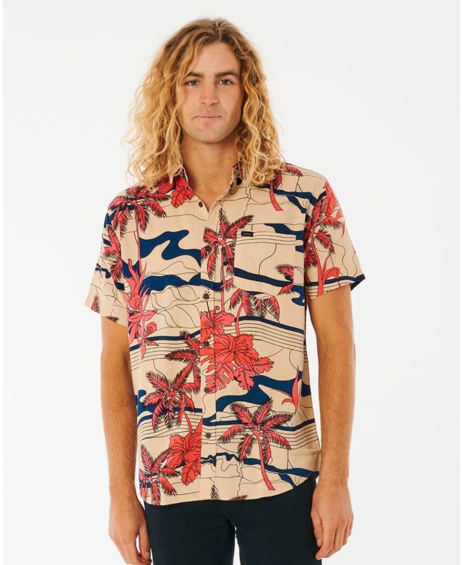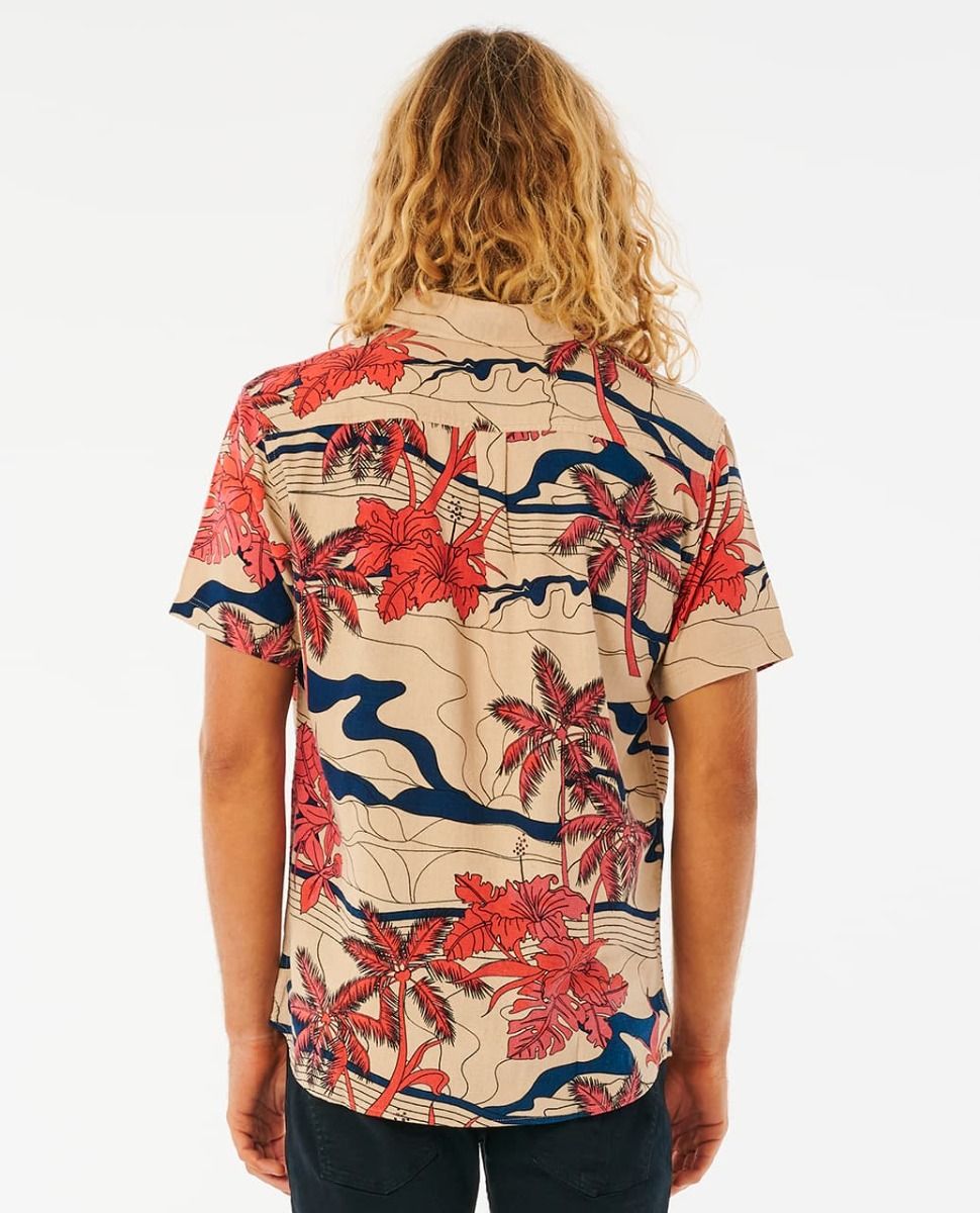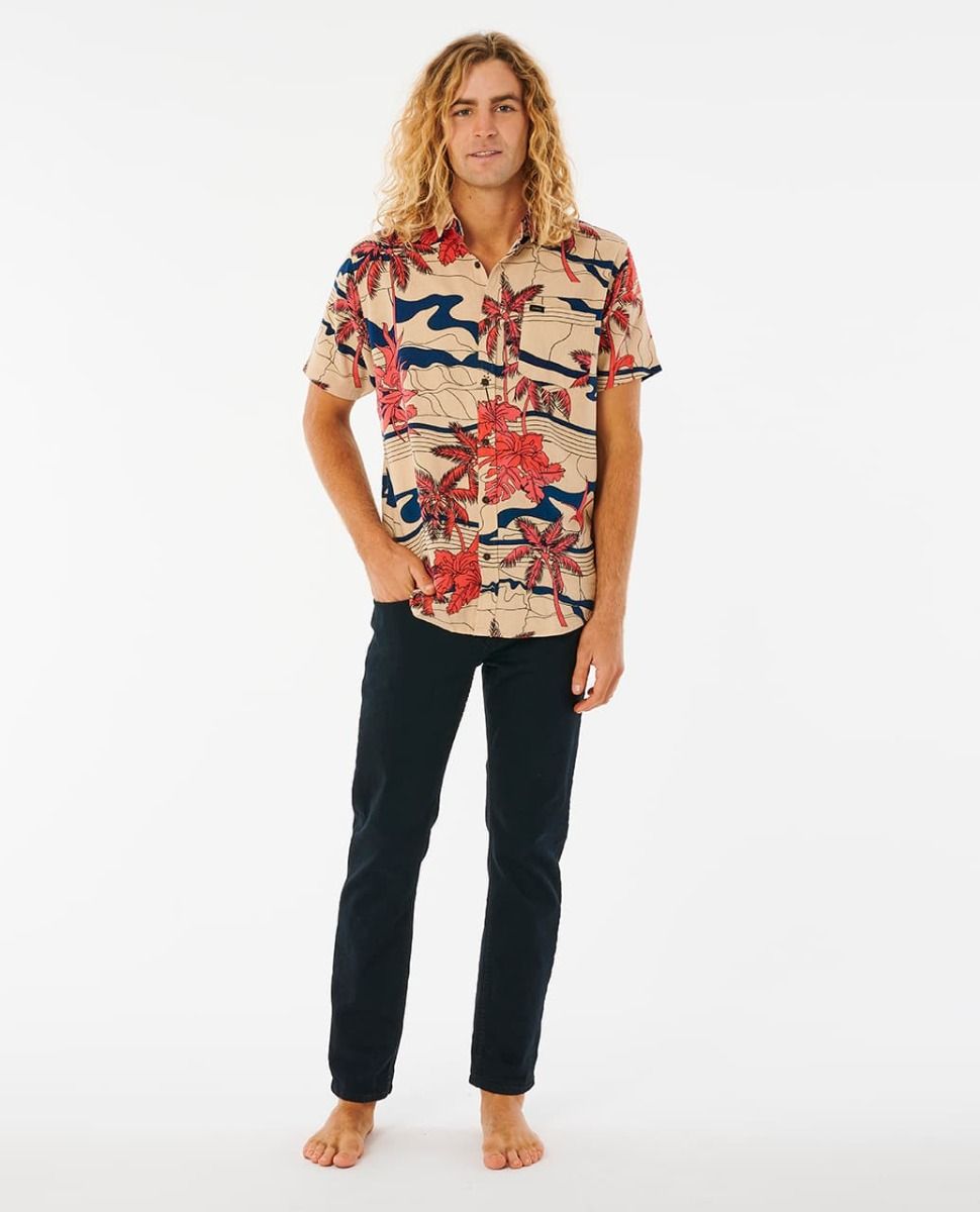 Esta camisa surfera de ajuste estándar cuenta con manga corta, cuello clásico, bolsillo en el pecho, cierre de botones, estampado de estilo tropical en toda la prenda y una discreta etiqueta de Rip Curl tejida en el bolsillo.