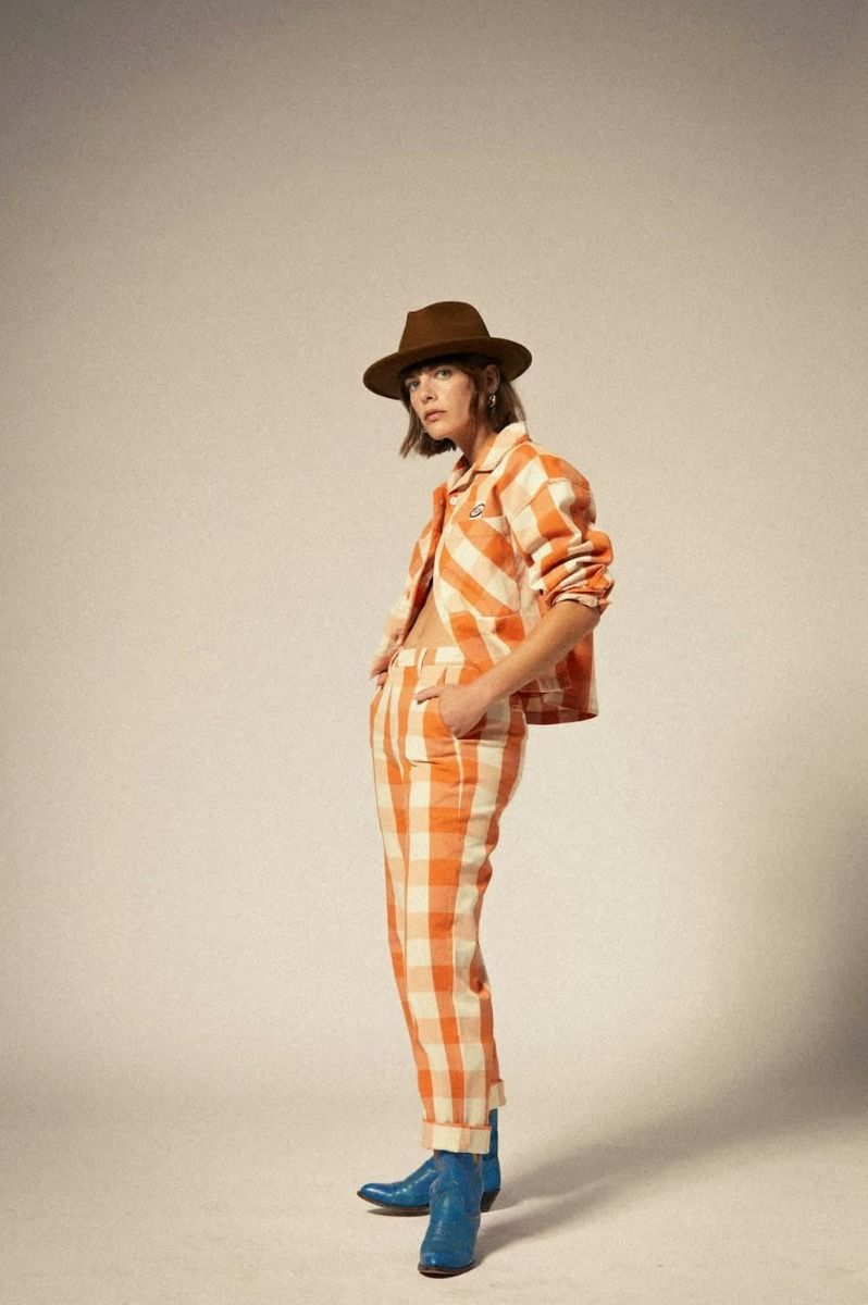Sobrecamisa Brixton mujer en cuadros Tangerine. Corte relajado, tejido de algodón reciclado y diseño versátil para llevar a capas o como prenda ligera.