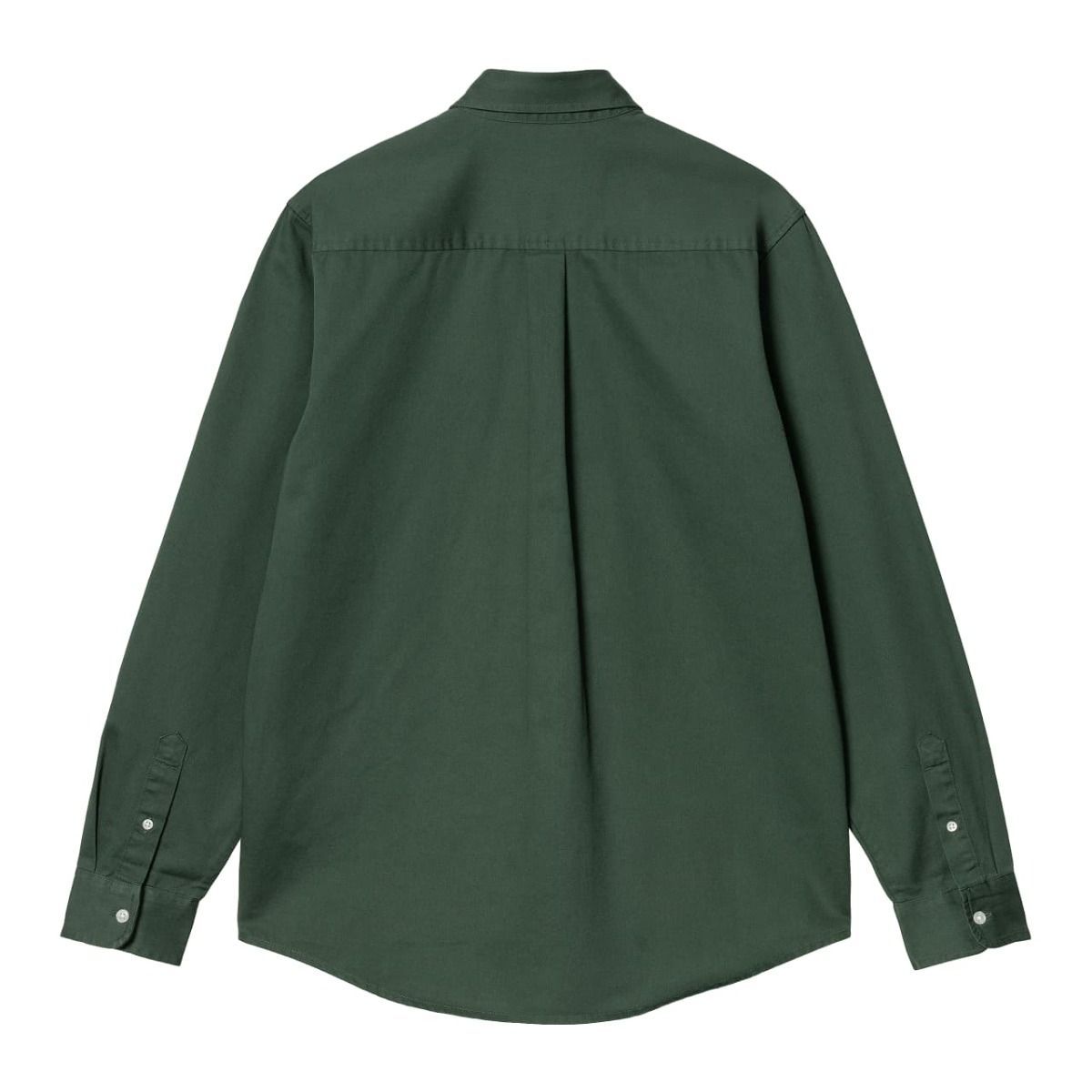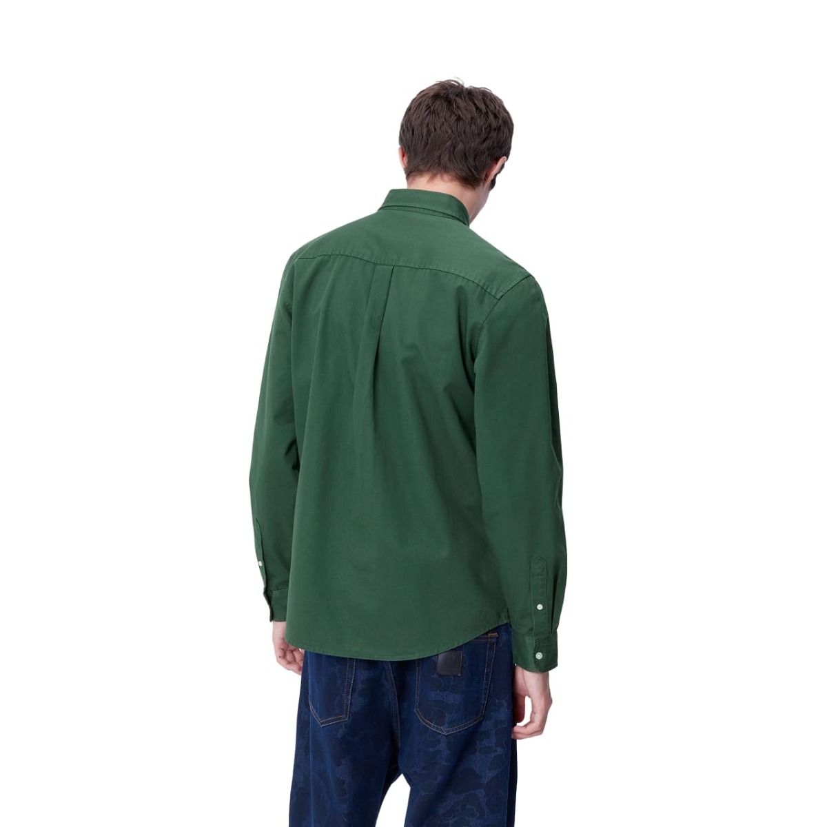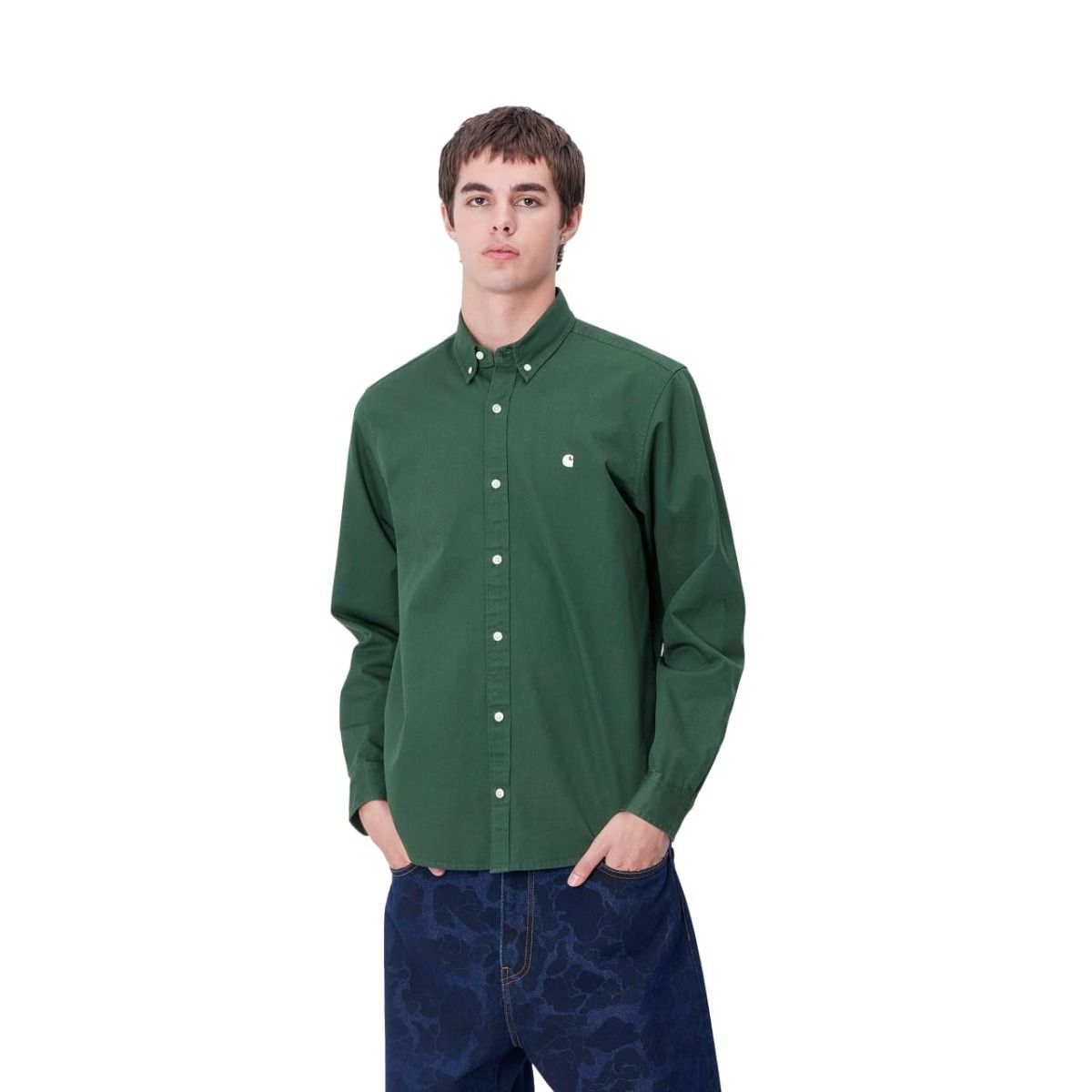 Esta elegante camisa verde sicomoro cuenta con tejido sometido a lavado intenso, ajuste regular, cuello de botones, manga larga, cierre de botonadura en contraste, dobladillo curvado, una etiqueta rectangular Carhartt WIP tejida y el logotipo de la «C» de Carhartt bordado en blanco cera en el lado izquierdo del pecho.