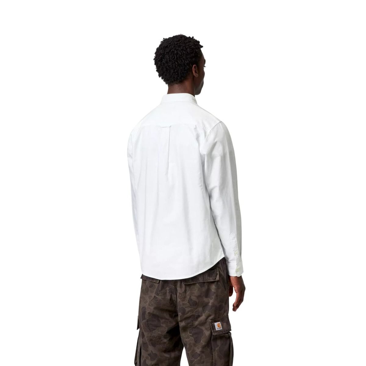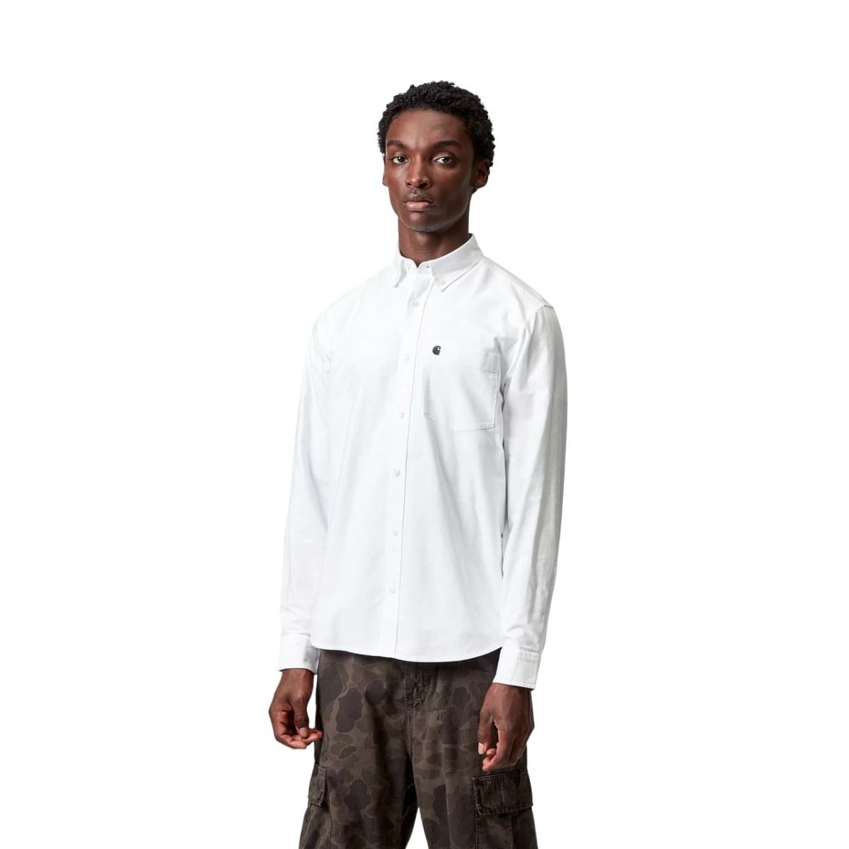 Camisa blanca de manga larga Carhartt WIP C-Logo con logo bordado y corte regular. Perfecta para looks urbanos y versátiles.