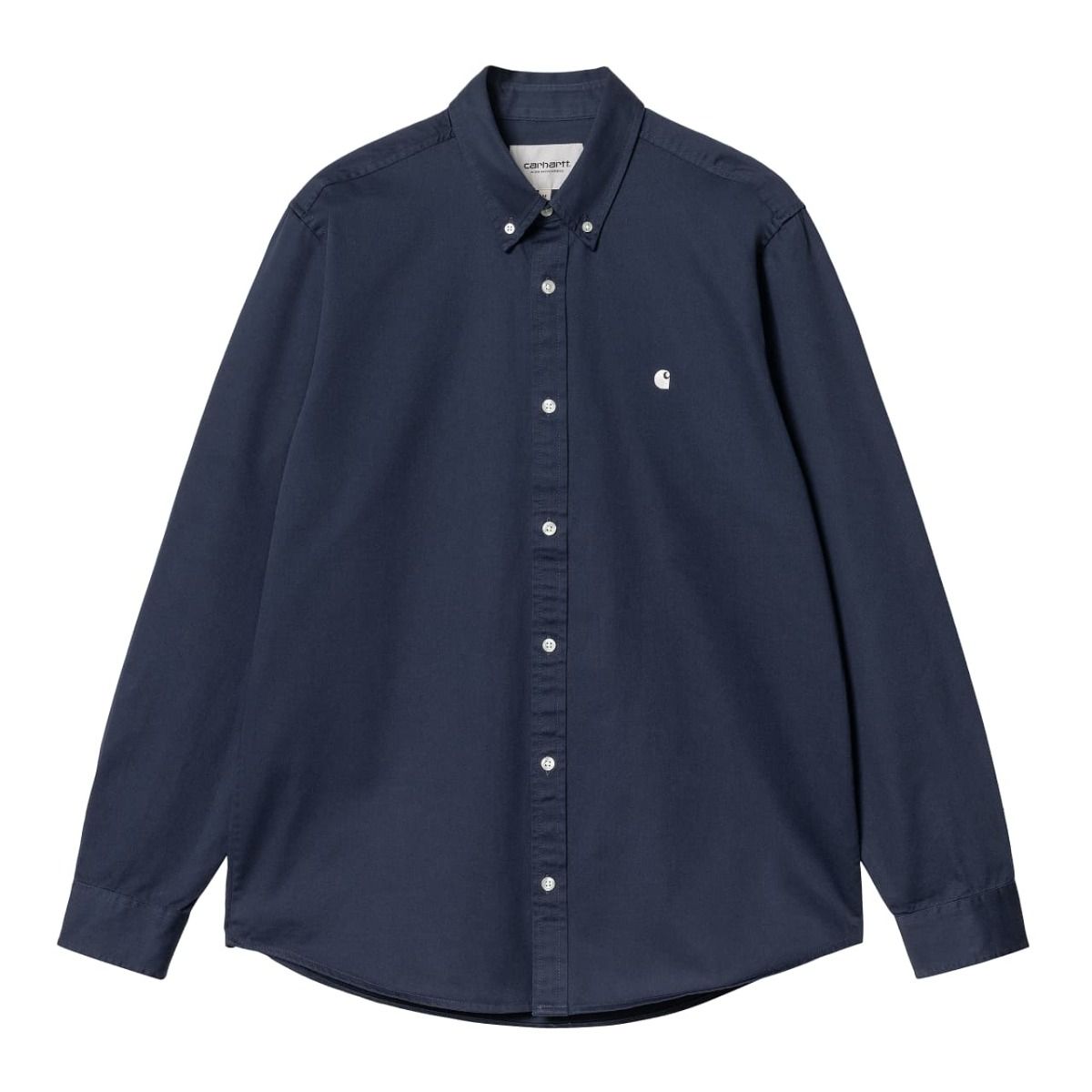 La camisa clásica de manga larga para hombre L/S Madison Shirt en tono azul marino con el logo de Carhartt WIP en color blanco cera (Air Force Blue-Wax) está confeccionada con 100% sarga de algodón de peso medio (6,3oz).