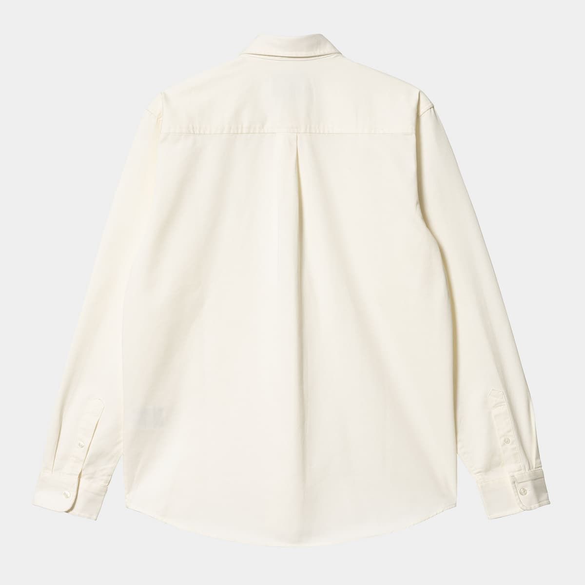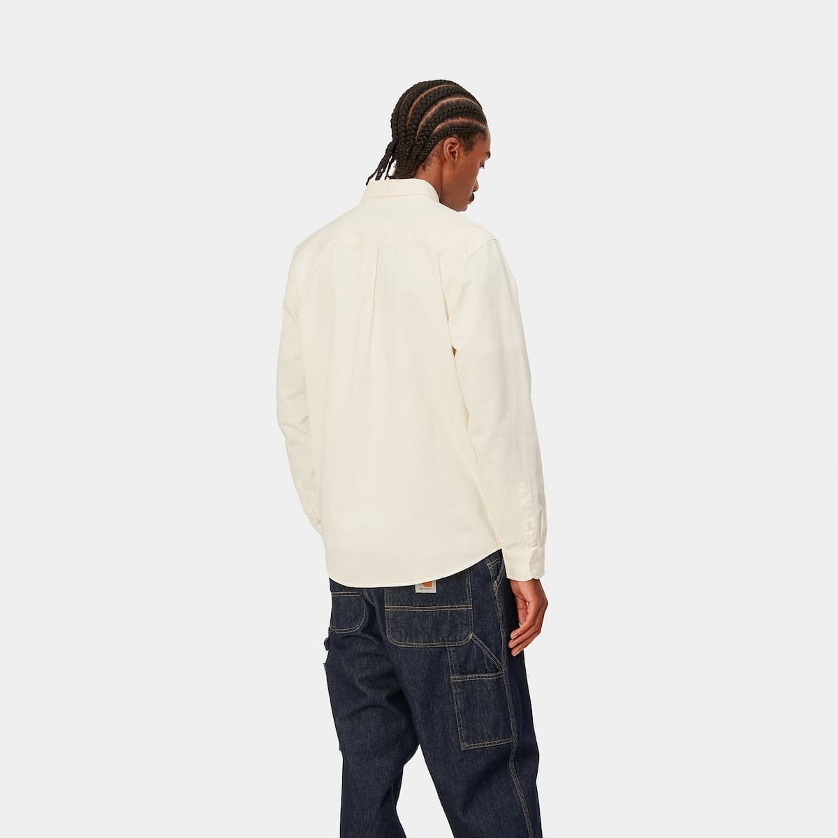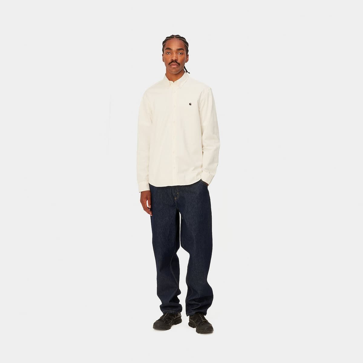 La camisa de manga larga para hombre L/S Madison Shirt en tono blanco cera con el logo de Carhartt WIP en negro (Wax-Black) está confeccionada con 100% sarga de algodón de peso medio (6,3oz).
