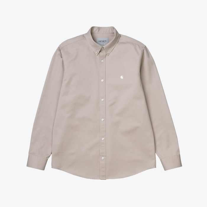 La camisa de manga larga para hombre Madison en tono beige con el logo de Carhartt WIP en blanco (Glaze/Wax) está confeccionada con sarga de algodón de peso medio y sometida a lavado intenso.