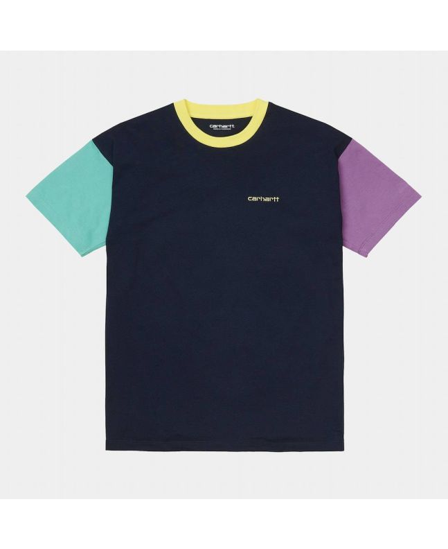 Esta camiseta de corte regular cuenta con cuello redondo, manga corta, mangas y cuello en color de contraste, y el emblemático logo de Carhartt WIP en texto bordado en contraste en el pecho.