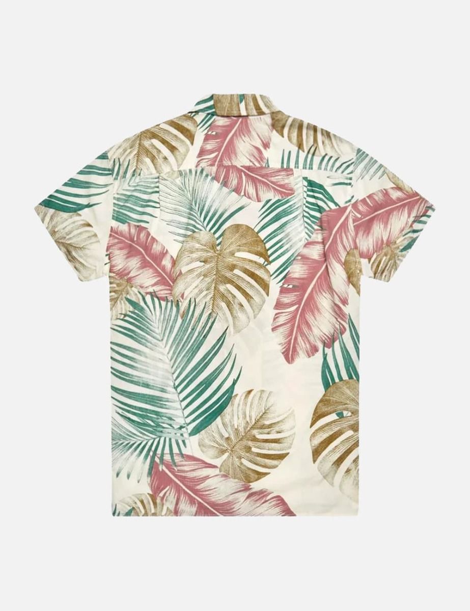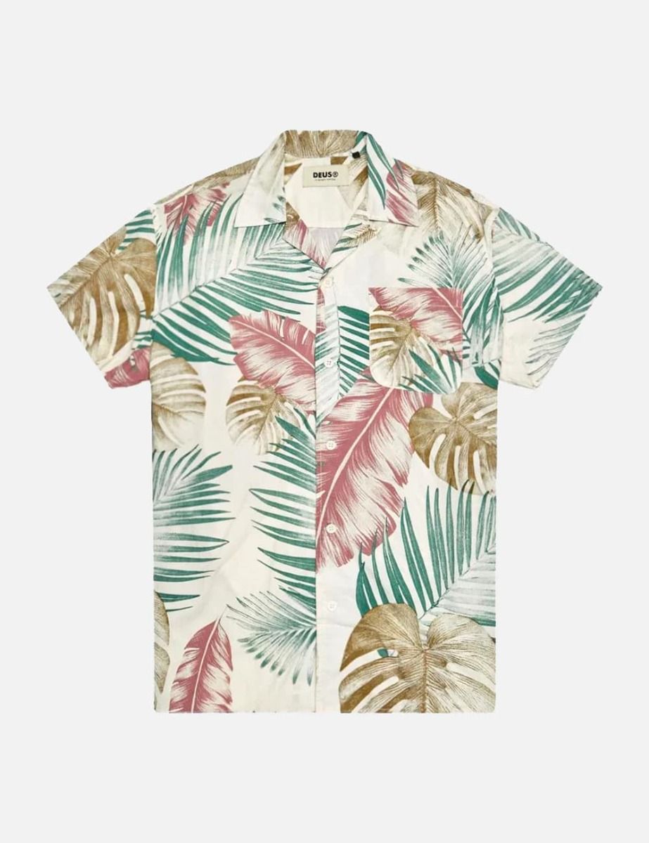 ¡Olvídate de las camisas aburridas y lánzate a por un look de inspiración tropical con la Camisa de manga corta Dean Noosa Crema para hombre de Deus Ex Machina!