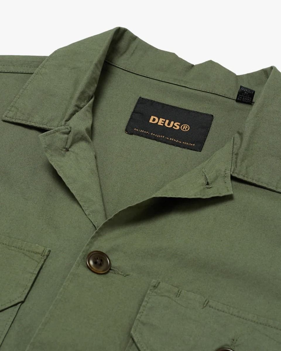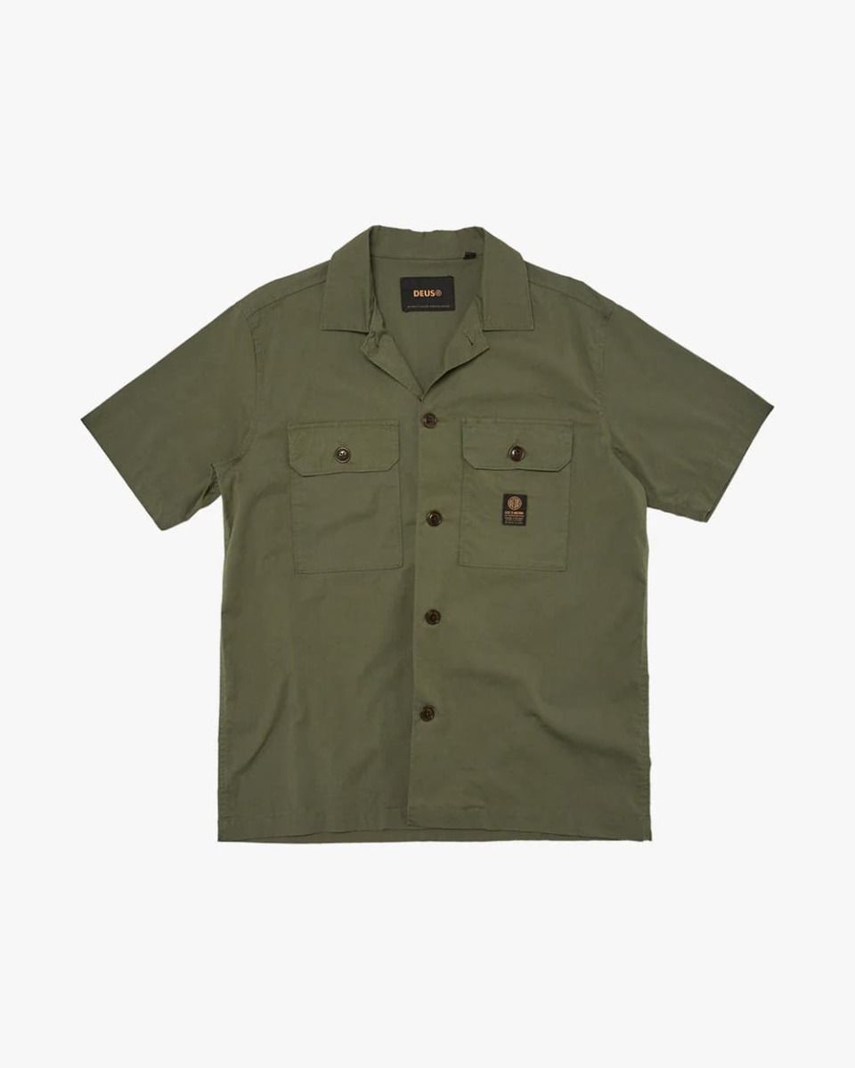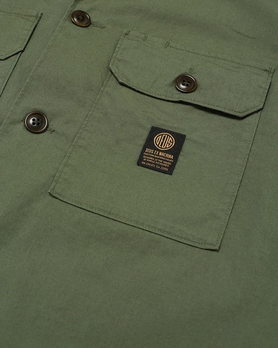 Esta camisa de inspiración militar cuenta con ajuste relajado, manga corta, cuello abierto, cierre de botones, dos bolsillos de estilo workwear en el pecho, un parche de Deus Ex Machina bordado en uno de los bolsillos y una etiqueta de garantía Deus tejida en el cuello interior.