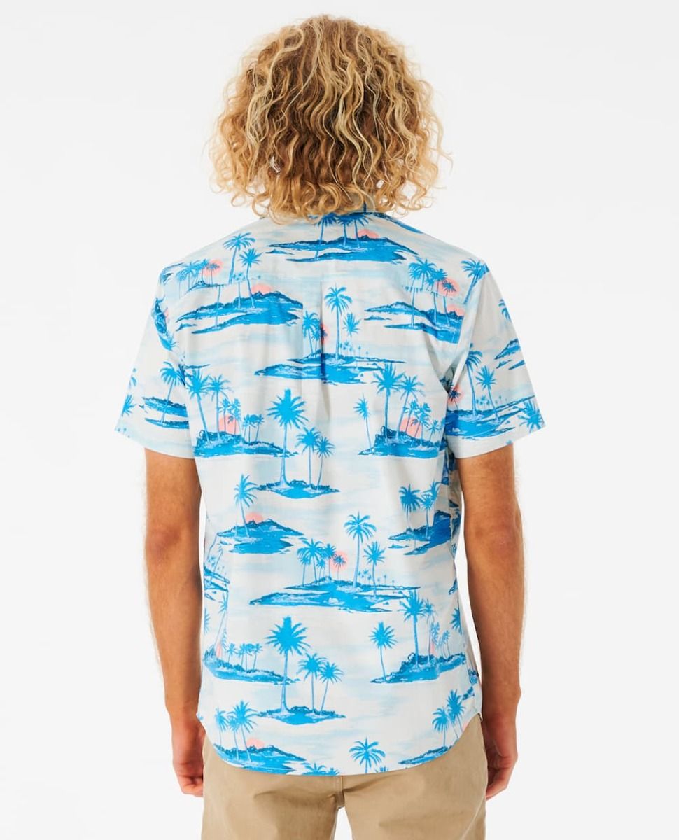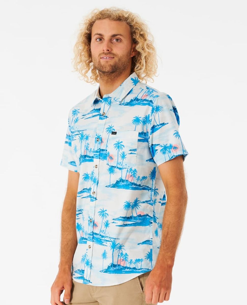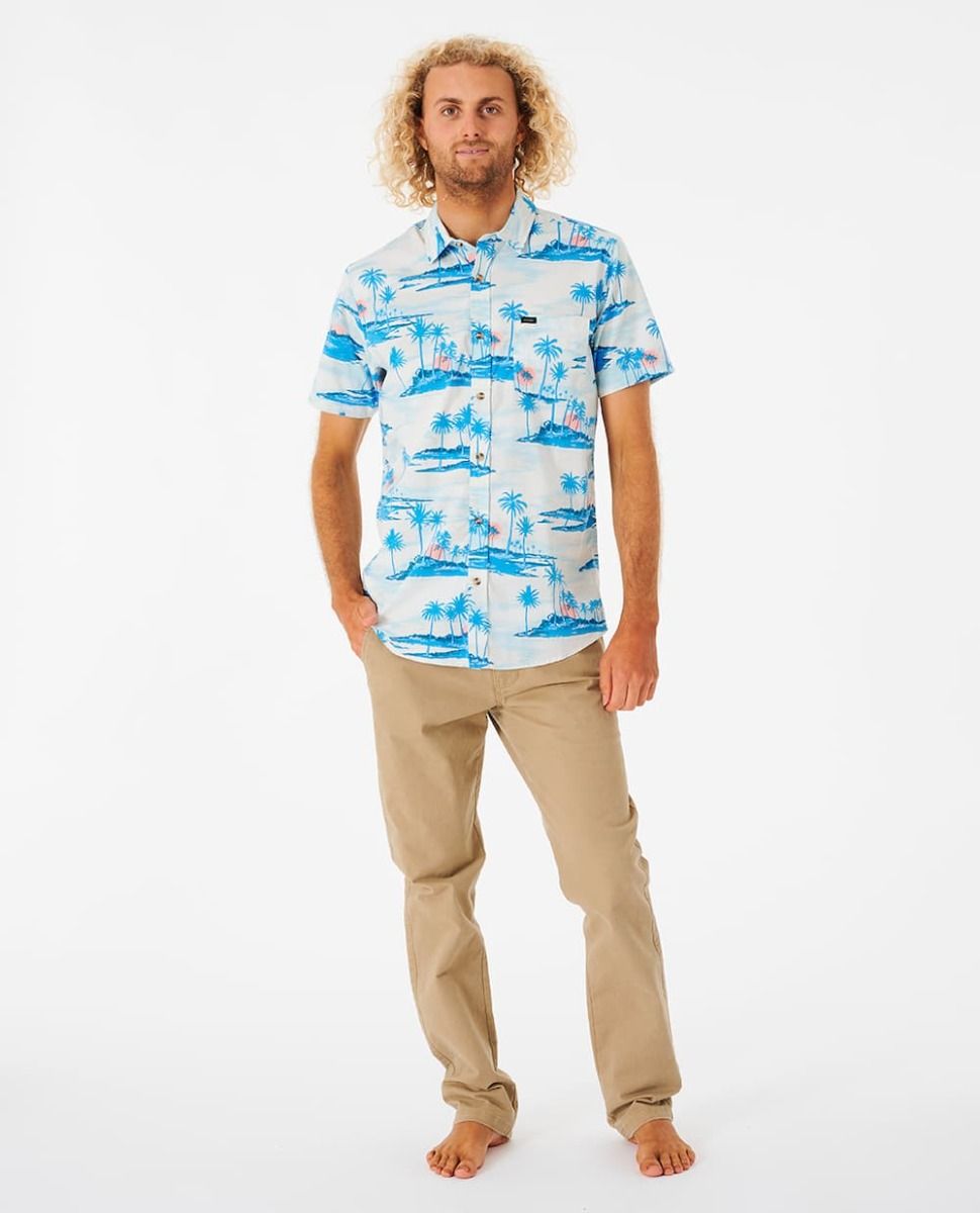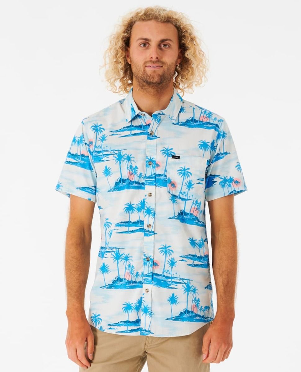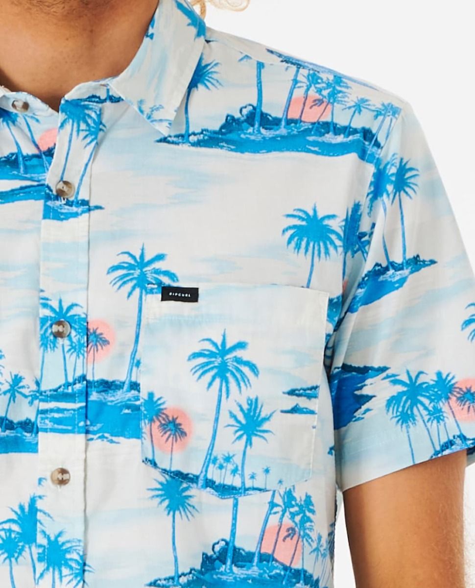 Esta camisa surfera de ajuste estándar cuenta con manga corta, cuello clásico, bolsillo en el pecho, cierre de botones, estampado de estilo tropical en tono azulado por toda la prenda y una discreta etiqueta de Rip Curl tejida en el bolsillo.