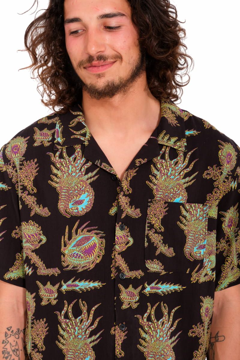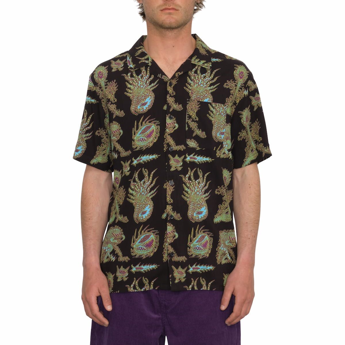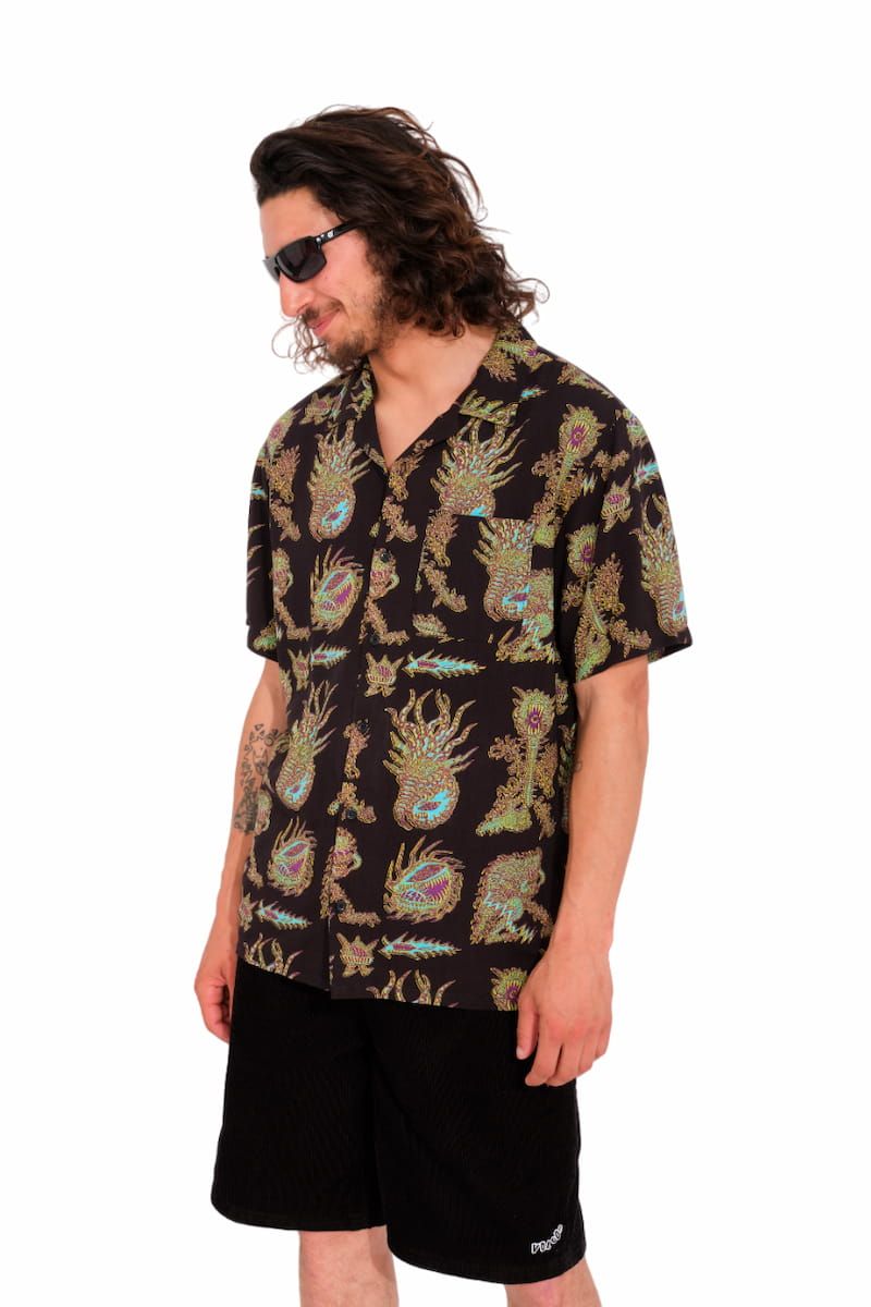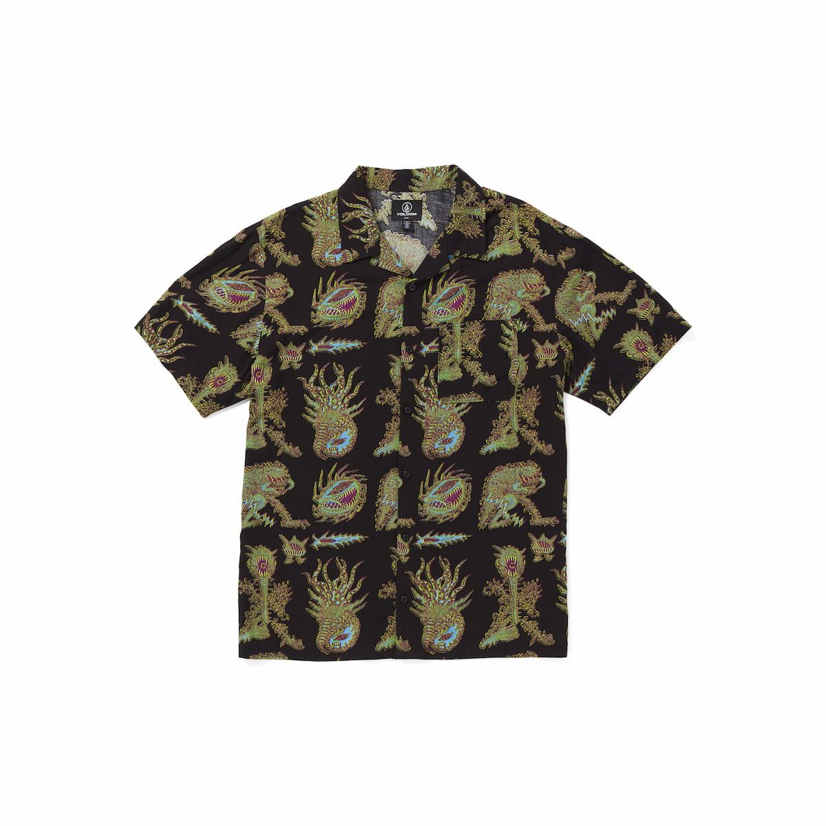 Esta camisa playera de corte clásico, perteneciente a la Colección Featured Artist de Volcom, cuenta con manga corta, un bolsillo de parche en el pecho, cierre de botones con logo Volcom, estampado con gráficos diseñados por el artista Tetsunori Tawaraya y una pequeña etiqueta de la marca tejida.