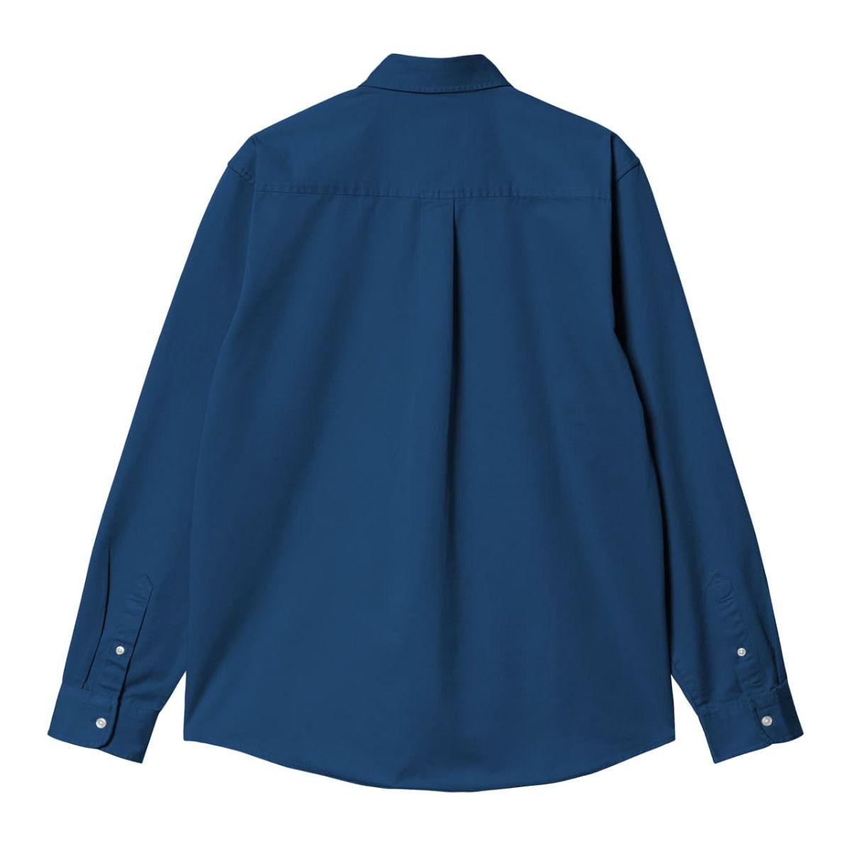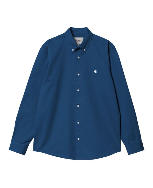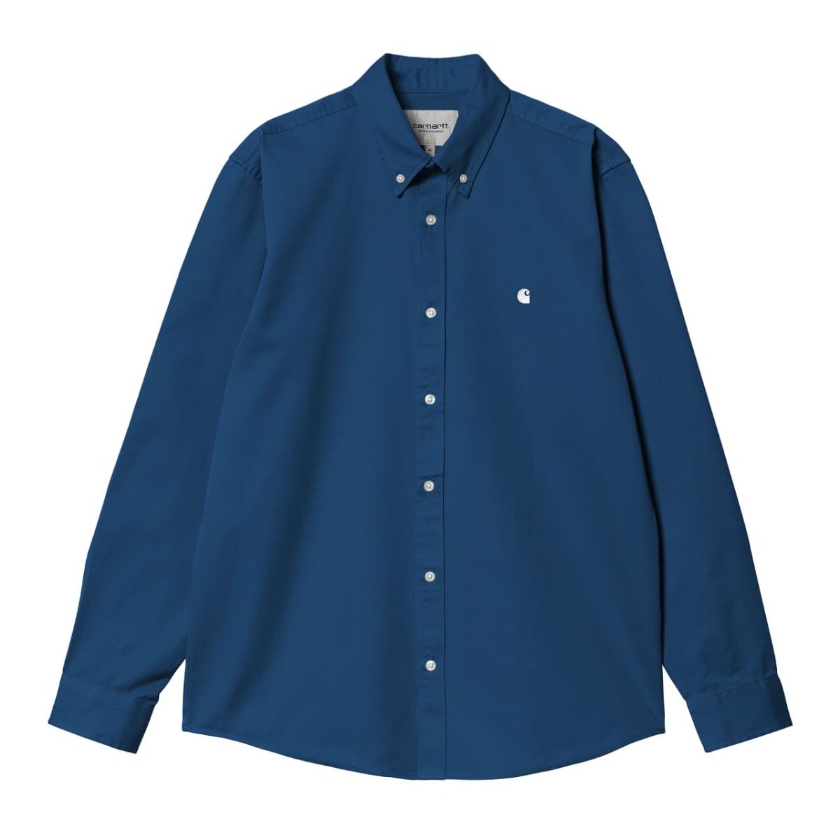 La camisa clásica de manga larga para hombre L/S Madison Shirt en azul con el logo de Carhartt WIP en color blanco (Elder-White) está confeccionada con 100% sarga de algodón de peso medio (6,3oz).